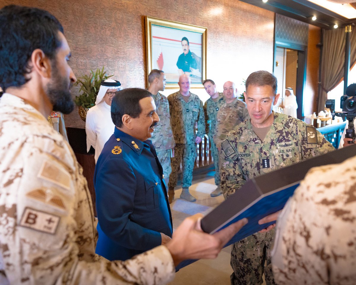 His Majesty King #Hamad_bin_Isa Al Khalifa, Supreme Commander of the Armed Forces, along with His Royal Highness the Crown Prince, Deputy Supreme Commander of the Armed Forces and Prime Minister, #Salman_bin_Hamad Al Khalifa, receives Admiral Charles Bradford Cooper II, Commander https://x.com/BahrainCPnews/status/2043762718310904159/photo/1