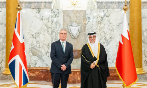 سمو ولي العهد رئيس مجلس الوزراء في مقدمة مستقبلي رئيس وزراء المملكة المتحدة وإيرلندا الشمالية لدى وصوله إلى مملكة البحرين