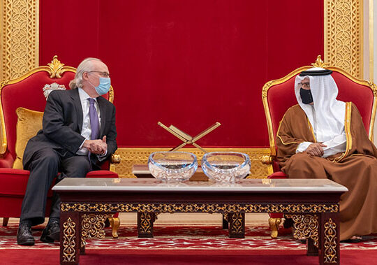 His Royal Highness Prince Salman bin Hamad Al Khalifa, the Crown Prince and Prime Minister, today received HH Sheikh Suroor bin Mohammed Al Nahyan and his accompanying delegation, to offer condolences following the passing of His Royal Highness Prince Khalifa bin Salman Al Khalifa, at Sakhir Air Base.