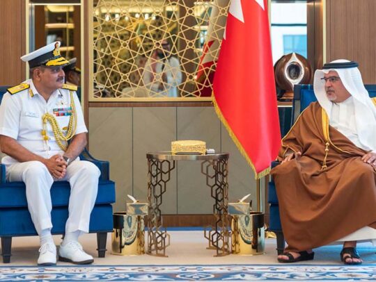 His Royal Highness Prince Salman bin Hamad Al Khalifa, the Crown Prince, Deputy Supreme Commander of the Armed Forces, and Prime Minister, today received the Republic of India’s Commander of the Western Fleet, Rear Admiral Vineet S McCarty, and an accompanying delegation at Gudaibiya Palace.