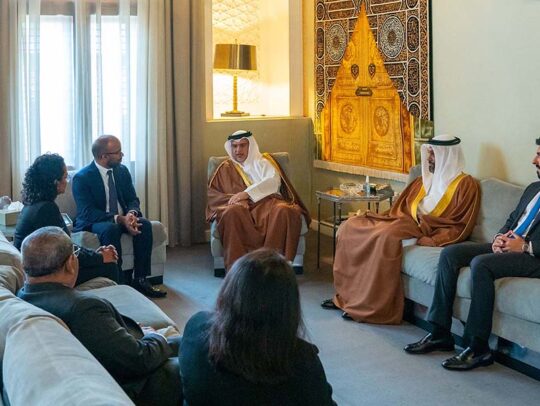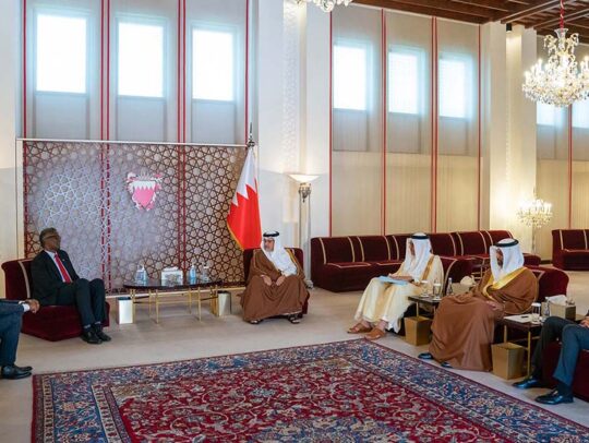 His Royal Highness Prince Salman bin Hamad Al Khalifa, the Crown Prince and Prime Minister, today met with the Republic of Maldives’ Minister of Finance, HE Ibrahim Ameer, and Minister of Environment, Climate Change and Technology, HE Aminath Shauna, at Riffa Palace.
