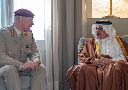The Deputy King, His Royal Highness Prince Salman bin Hamad Al Khalifa today met Lieutenant General Sir John Lorimer, the United Kingdom’s Defence Senior Advisor to the Middle East, at Riffa Palace.