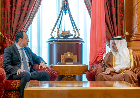 The Deputy King, His Royal Highness Prince Salman bin Hamad Al Khalifa, today received the Minister of Foreign Affairs of the Republic of Cyprus, His Excellency Nikos Christodoulides, at Gudaibiya Palace.