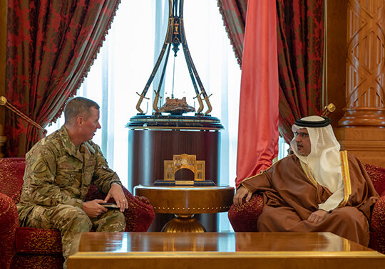 His Royal Highness Prince Salman bin Hamad Al Khalifa, Crown Prince, Deputy Supreme Commander and First Deputy Prime Minister today met the Deputy Commander of the United States’ Central Command, Lieutenant General Thomas W. Bergeson, at Al Gudaibiya Palace.
