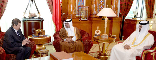 His Royal Highness Prince Salman bin Hamad Al-Khalifa, Crown Prince, Deputy Supreme Commander and First Deputy Prime Minister today met with the Minister of State of the United Arab Emirates (UAE) Federal Cabinet, Mubadala’s Chief Executive Officer for energy and Chairman of Masdar, His Excellency Dr. Sultan Bin Ahmed Al Jaber, and Minister of Energy, His Excellency Mr. Suhail Al Mazrouei at Gudaibiya Palace.