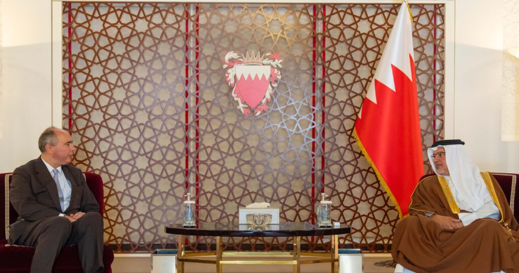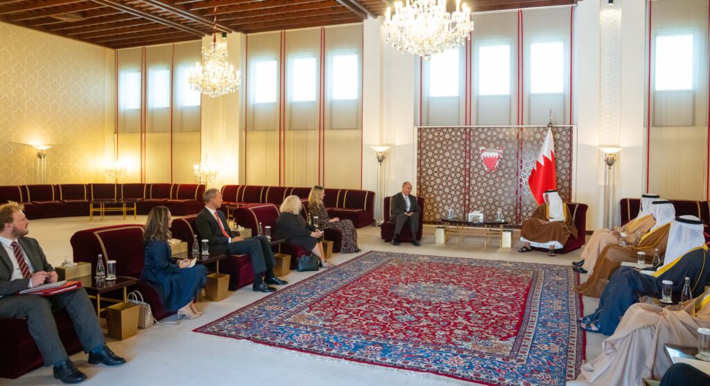 The Deputy King, His Royal Highness Prince Salman bin Hamad Al Khalifa, today met with the Minister of State for Investment of the United Kingdom, Lord Dominic Johnson of Lainston, at Riffa Palace.