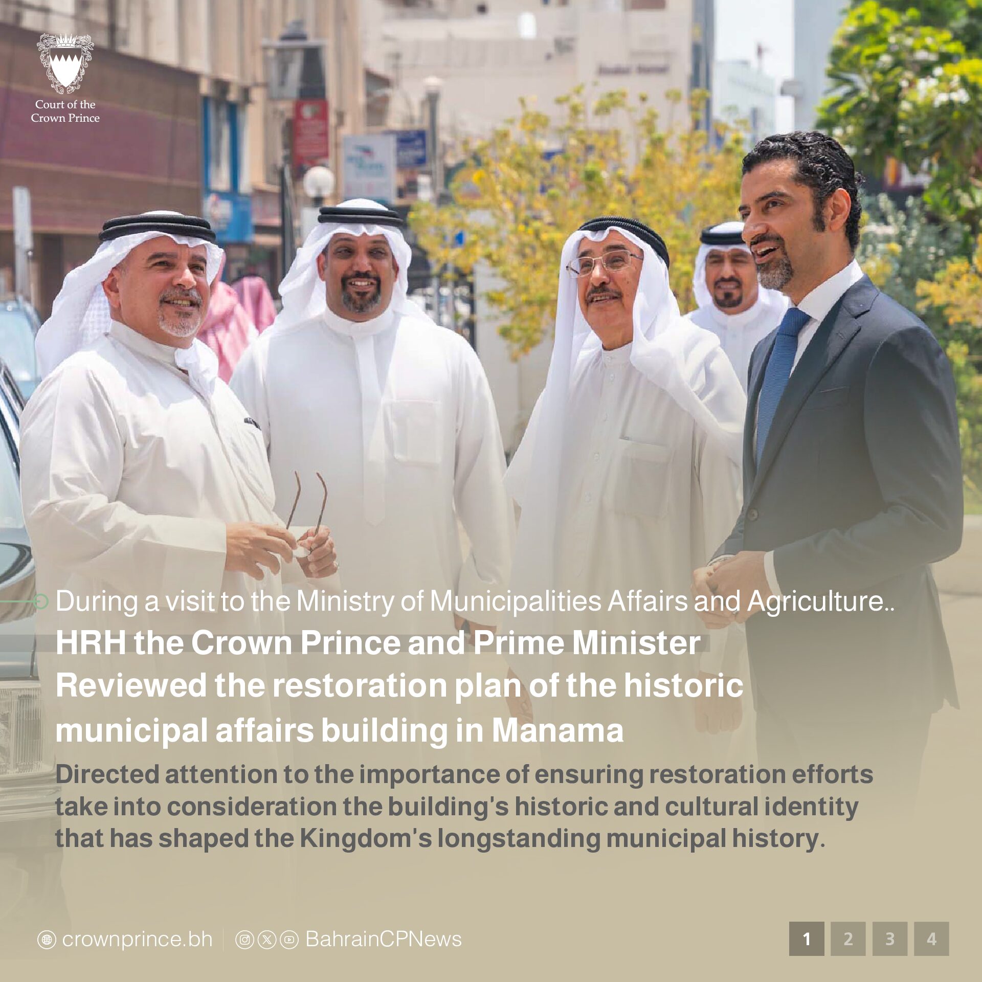 HRH the Crown Prince and Prime Minister was briefed by HE Eng Al Mubarak on the restoration plans of the Manama Municipal Affairs Building, and other strategic municipal projects.