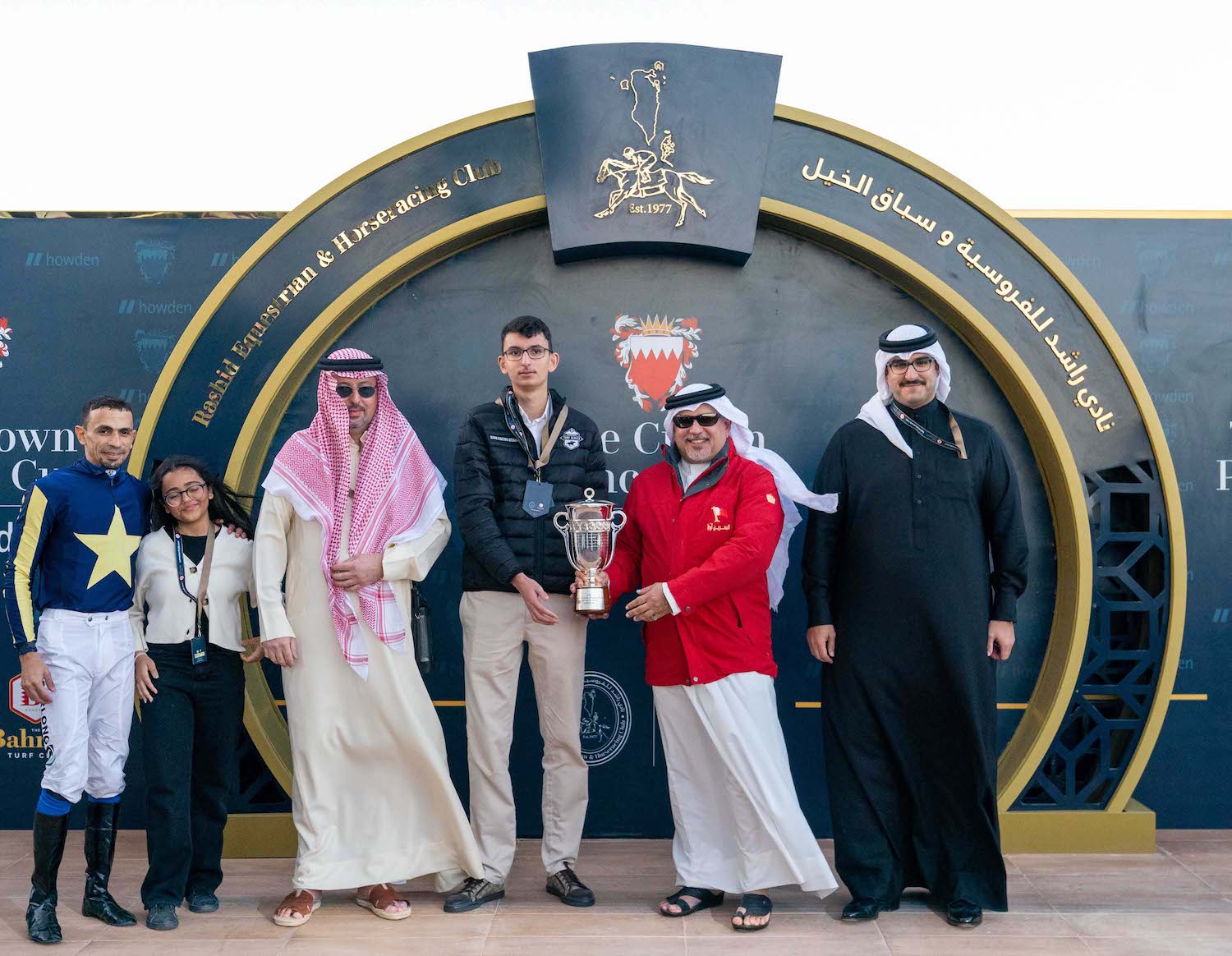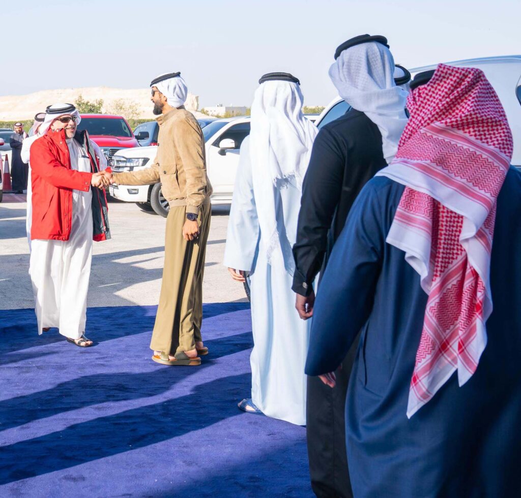 Ali Habib Qasim, a member of the REHC High Committee, presented the Anchorman Cup to the grandchildren of HH Sheikh Mohammed bin Rashid Al Maktoum, HH Shaikh Hamad bin Nasser bin Hamad Al Khalifa, HH Shaikh Mohammed bin Nasser bin Hamad Al Khalifa, and HH Shaikh Hamdan bin Nasser bin Hamad Al Khalifa, and the representative of the sponsoring company presented the Hawar Cup to the winner, Hasan Mefareh Alajmi.
