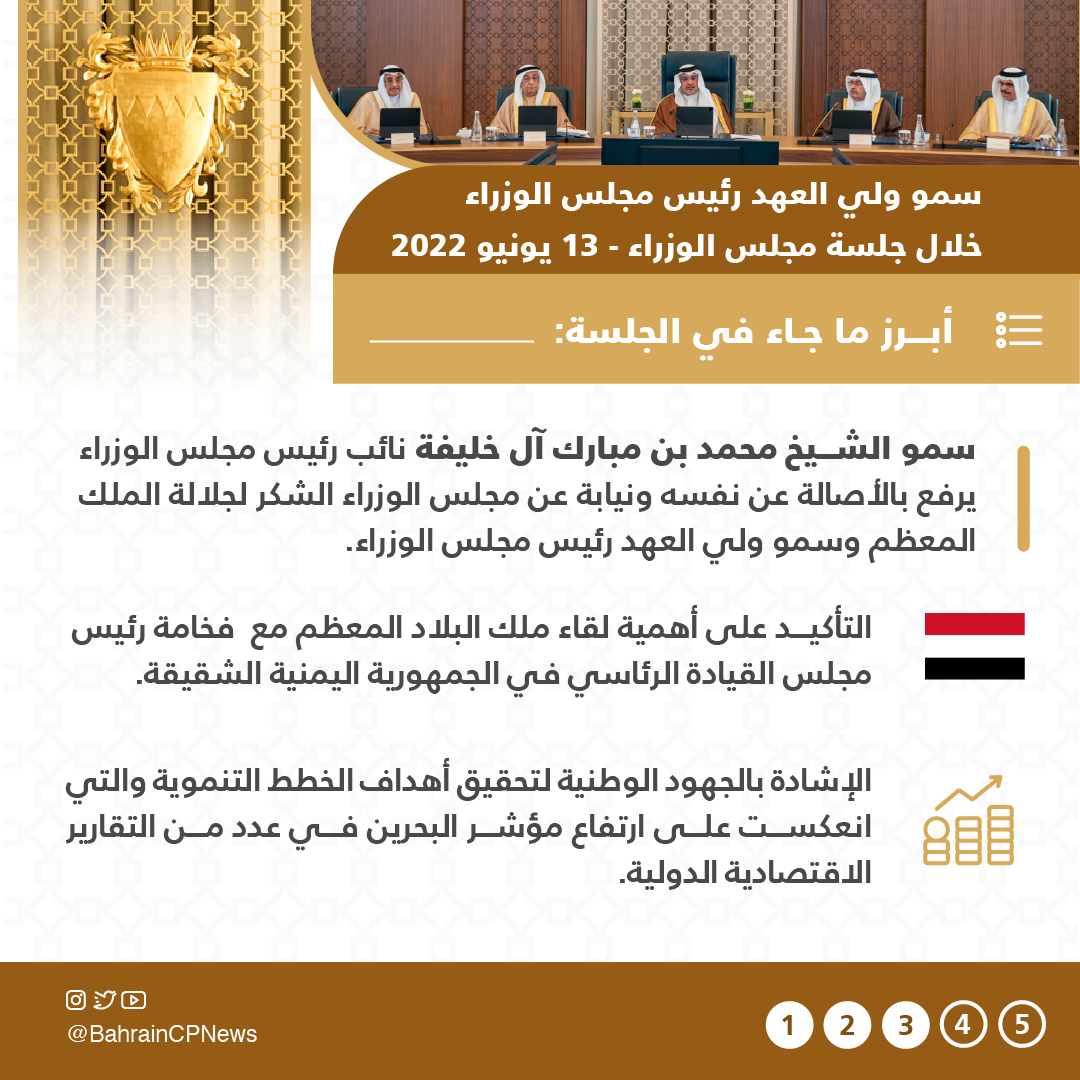 The Cabinet highlighted the meeting held between His Majesty King Hamad bin Isa Al Khalifa and the Head of the Republic of Yemen’s Presidential Leadership Council, Major General Dr Rashad Mohammed Al-Alimi, noting its role in strengthening relations between Bahrain and Yemen. The Cabinet reiterated the Kingdom of Bahrain’s support for the Yemeni Presidential Leadership Council in carrying out its duties, restoring legitimate authority, and achieving peace, security, stability, and development in Yemen.