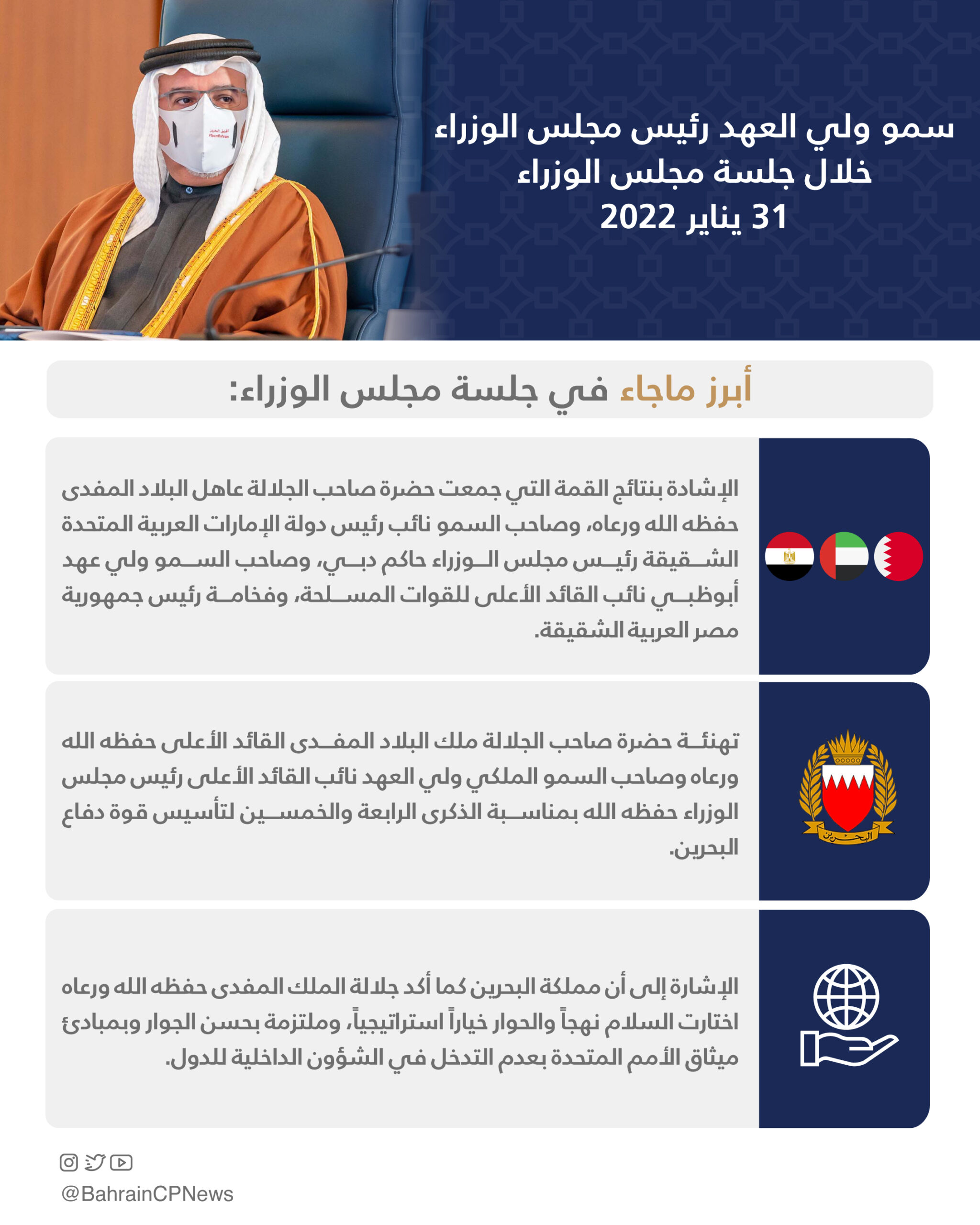 The Cabinet commended the outcomes of a meeting attended by His Majesty King Hamad bin Isa Al Khalifa, HH Sheikh Mohammed bin Rashid Al Maktoum, the Vice-President and Prime Minister of the UAE, and Ruler of Dubai, HH Sheikh Mohamed bin Zayed Al Nahyan, the Crown Prince of Abu Dhabi and Deputy Supreme Commander of the UAE Armed Forces, and the President of the Arab Republic of Egypt, HE Abdel Fattah El-Sisi.