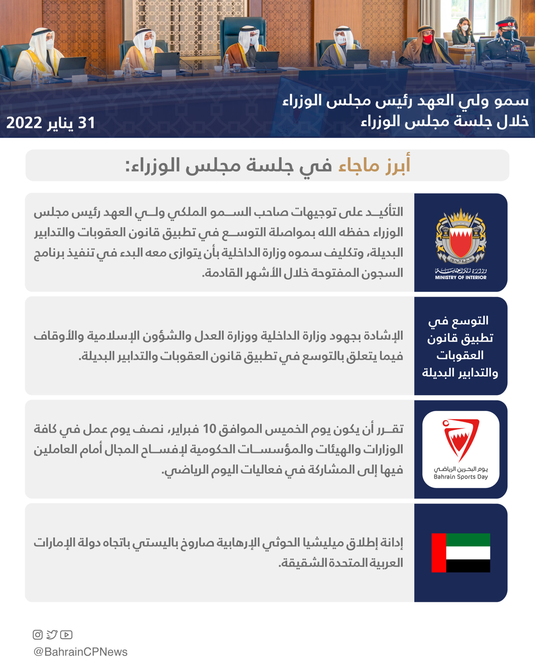 The Cabinet strongly condemned and denounced the launch of a ballistic missile by the terrorist Houthi militia against the United Arab Emirates (UAE). The Cabinet affirmed that the Kingdom of Bahrain supports all measures undertaken by the UAE to protect its security and stability.
