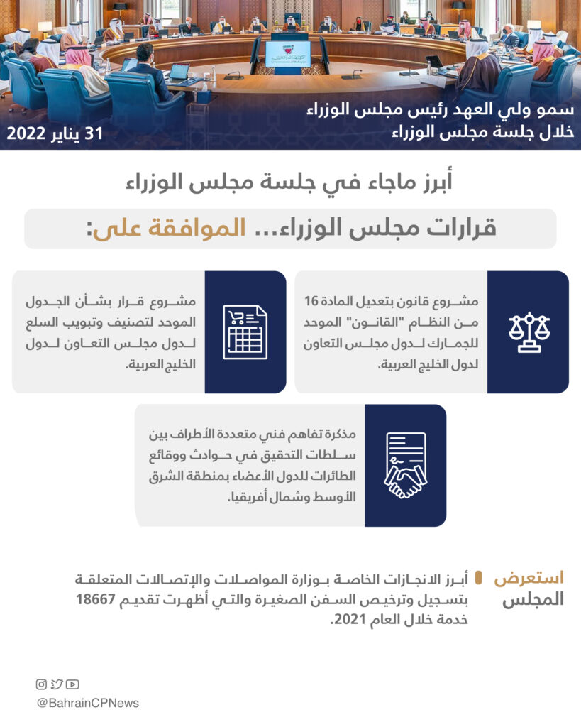 The Cabinet then took note of Ministerial reports regarding: the Kingdom’s participation in the consultative meeting of Arab Foreign Ministers and the World Food Forum 2022; the foreign participation of the ministers and the visits of foreign delegations to the Kingdom of Bahrain for the month of February.