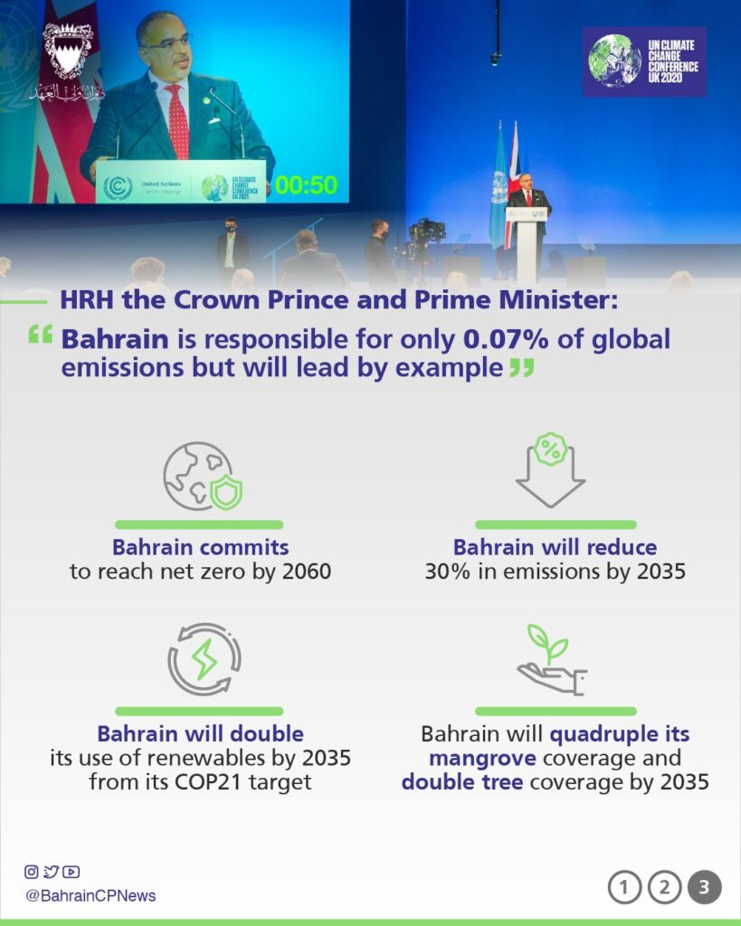 “Today, I am pleased to announce that Bahrain is committed to reaching net zero by 2060 and has set a range of ambitious interim goals to ensure that we proceed without delay. By 2035, we will reduce emissions by 30 percent through decarbonization and efficiency initiatives and double our deployment of renewables from the targets we set at COP21. Our 2035 targets also include carbon removal solutions by quadrupling mangrove coverage, doubling tree coverage in Bahrain, and directly investing in carbon capture technologies, which we believe is essential.