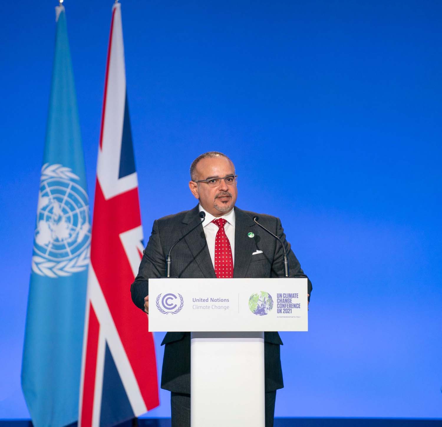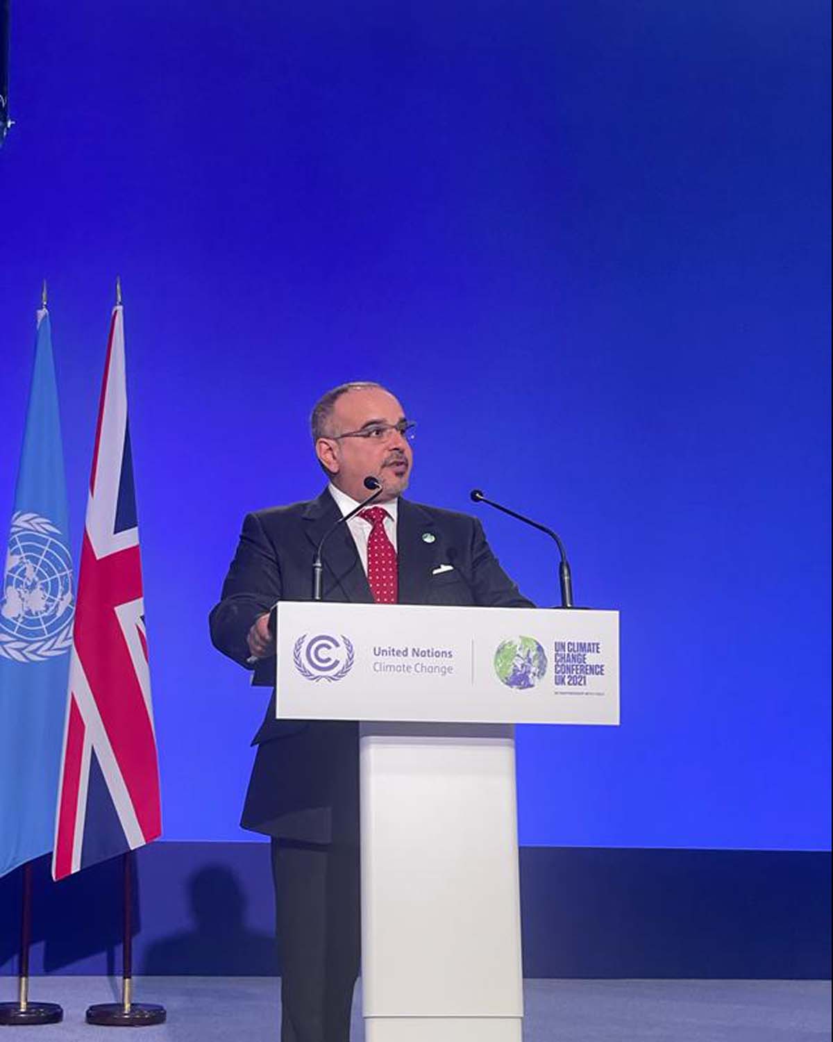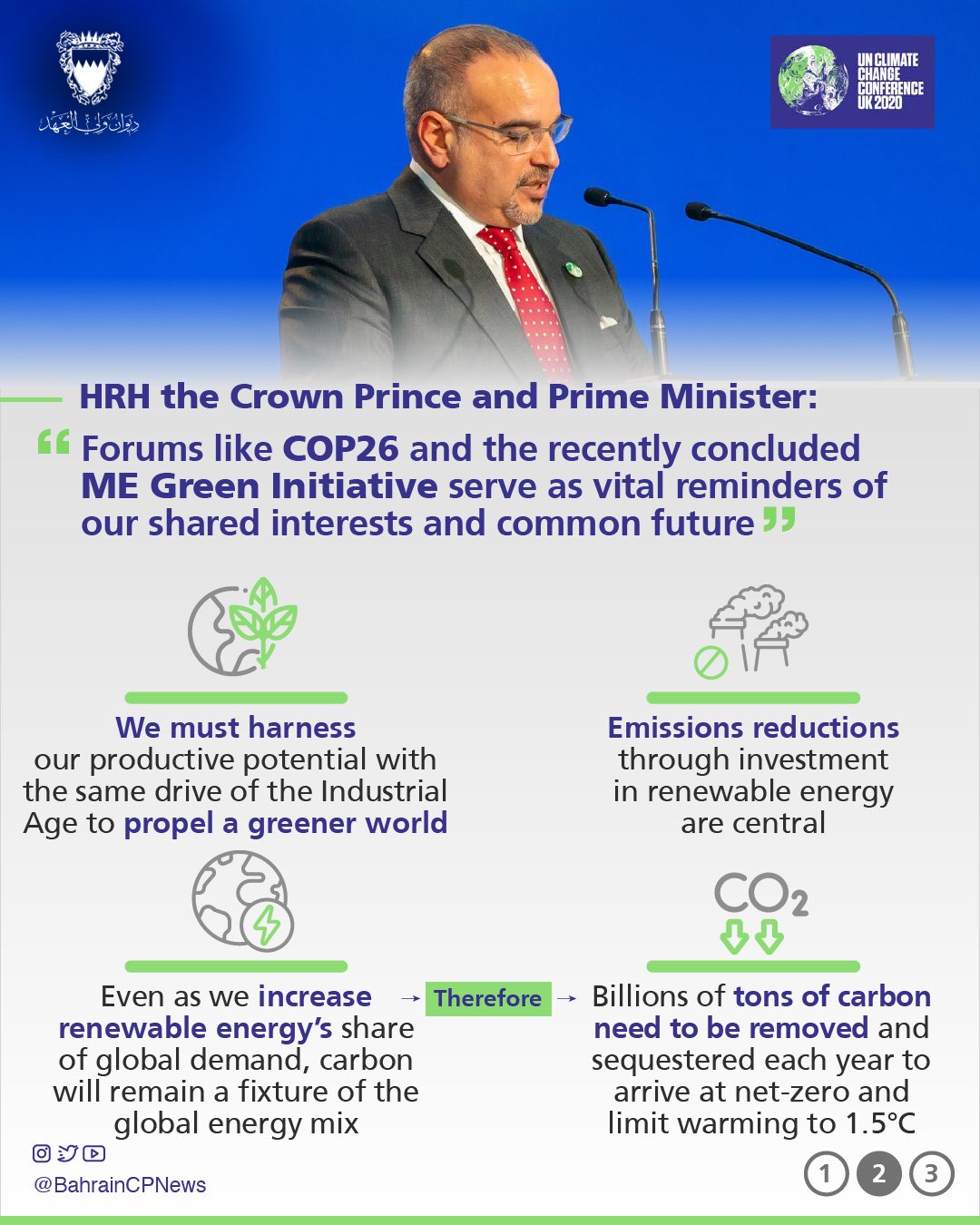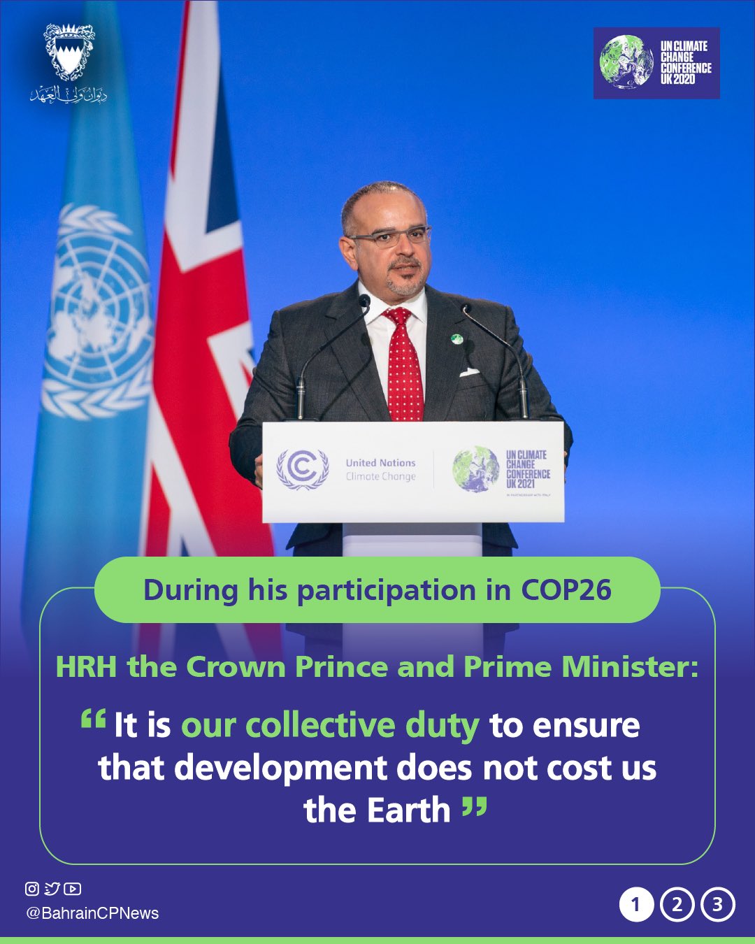 His Royal Highness Prince Salman bin Hamad Al Khalifa, the Crown Prince and Prime Minister, today delivered a speech at the 26th United Nations Climate Change Conference of the Parties (COP26), held in Glasgow, Scotland.