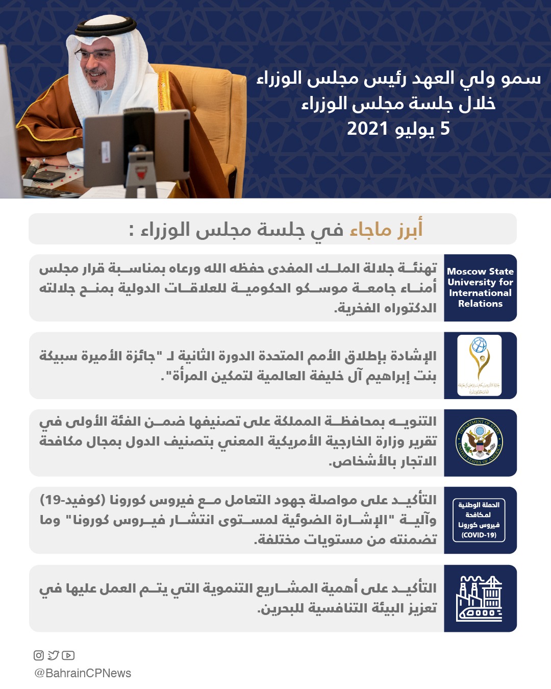 His Royal Highness Prince Salman bin Hamad Al Khalifa, the Crown Prince and Prime Minister, today chaired the weekly Cabinet meeting, held remotely.