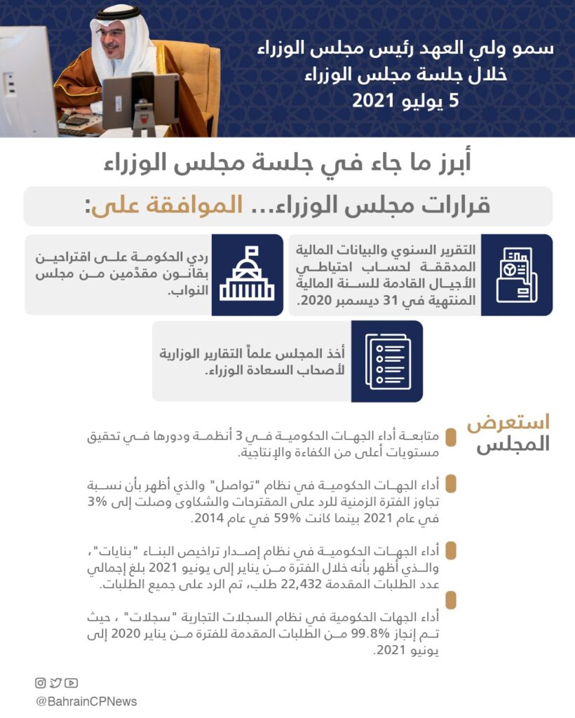 The Cabinet commended the launch of the second edition of the “Princess Sabeeka Bint Ibrahim Al Khalifa Global Award for Women’s Empowerment” by the United Nations. The Cabinet affirmed that the award is an extension of the ongoing progress and development of Bahraini women, which continues to receive the support of HM the King and HRH Princess Sabeeka bint Ibrahim Al Khalifa, consort of HM the King, and President of the Supreme Council for Women.