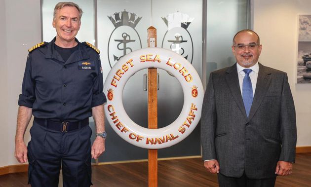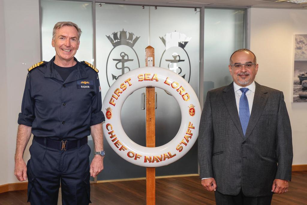 His Royal Highness Prince Salman bin Hamad Al Khalifa, the Crown Prince, Deputy Supreme Commander and Prime Minister, today met with the United Kingdom’s First Sea Lord and Chief of Naval Staff, Admiral Tony Radakin CB ADC, at the Navy Command Headquarters, Portsmouth.