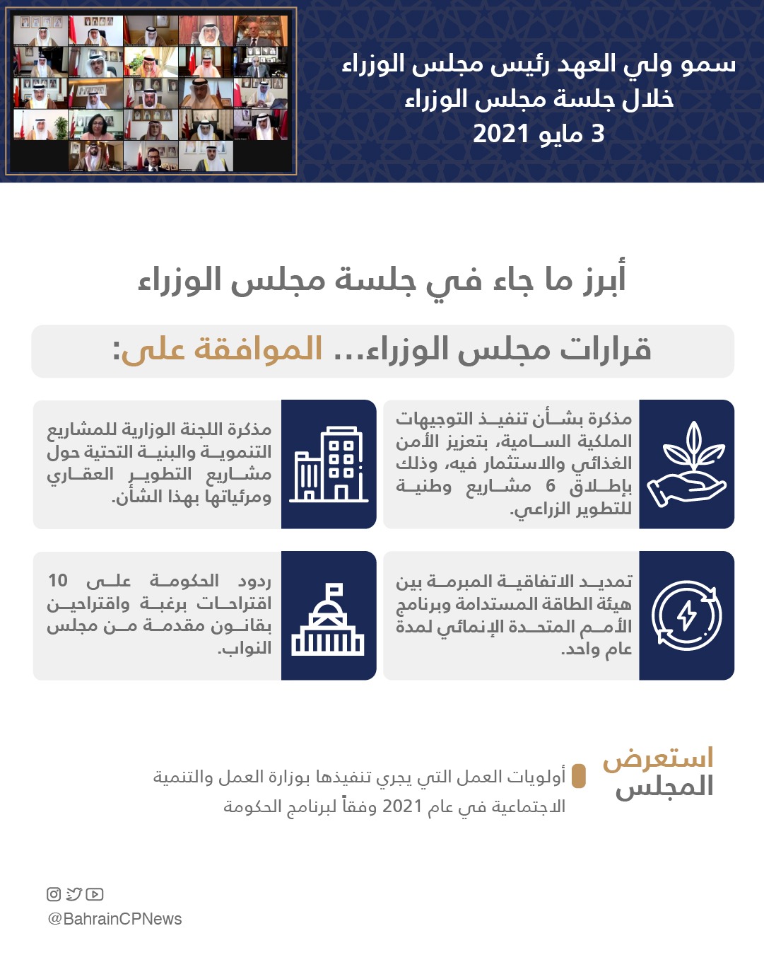 The Cabinet also praised national media outlets and Bahraini journalists for their service to public information, on the occasion of Bahraini Press Day, and further praised all Bahraini workers’ contributions on the occasion of International Workers Day.
