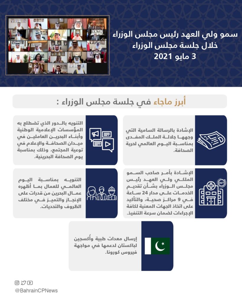 On the occasion of World Press Freedom Day, the Cabinet praised HM King Hamad bin Isa Al Khalifa’s appreciative message to the national media for their supportive role in the Kingdom’s COVID-19 response, led by Team Bahrain, under His Royal Highness’s leadership.