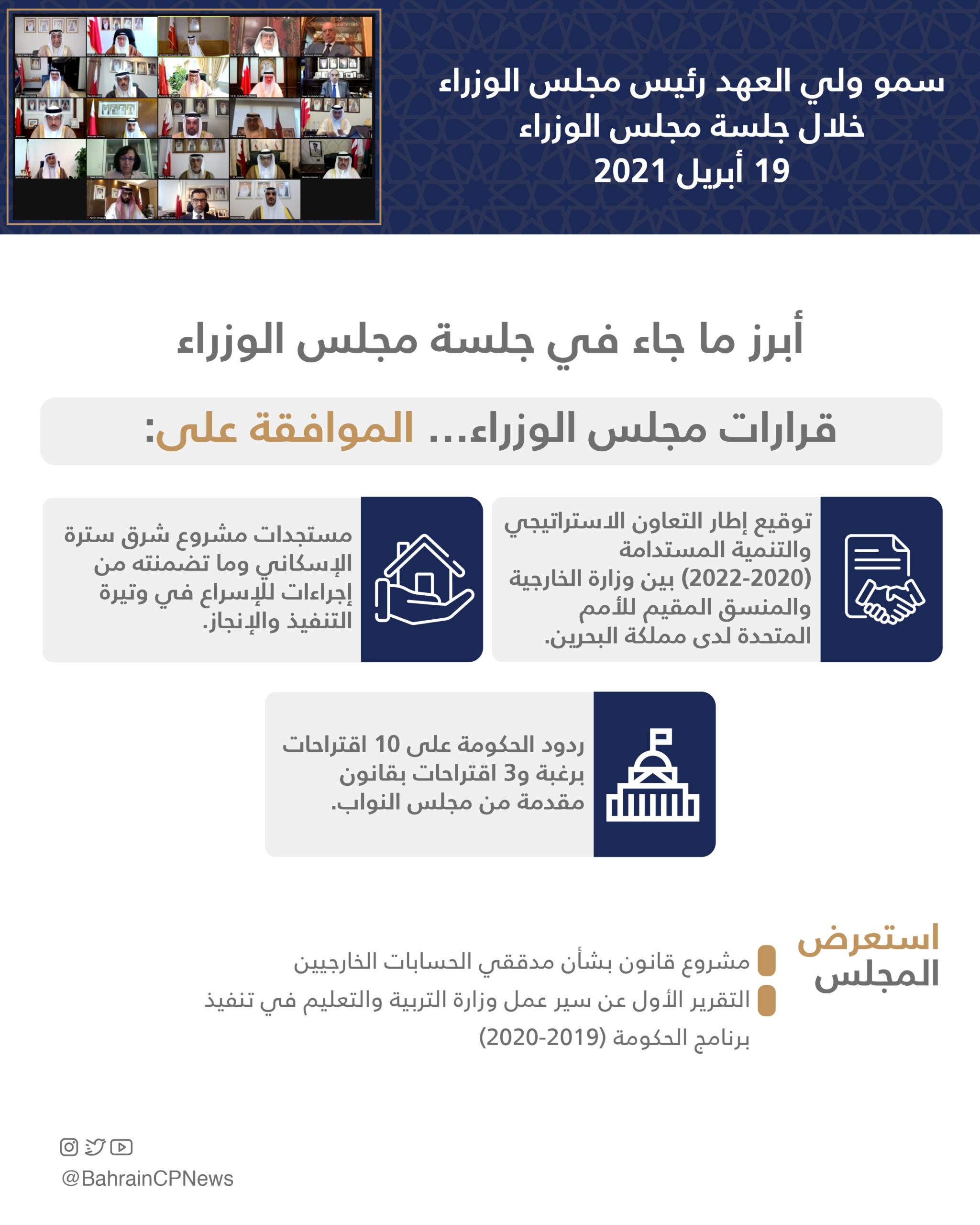 The Ministerial Committee for Legal and Legislative Affairs on the request for approval to sign the Strategic Cooperation and Sustainable Development Framework (2020-2022) between the Ministry of Foreign Affairs and the United Nations Resident Coordinator in the Kingdom of Bahrain, which establishes the framework for cooperation.