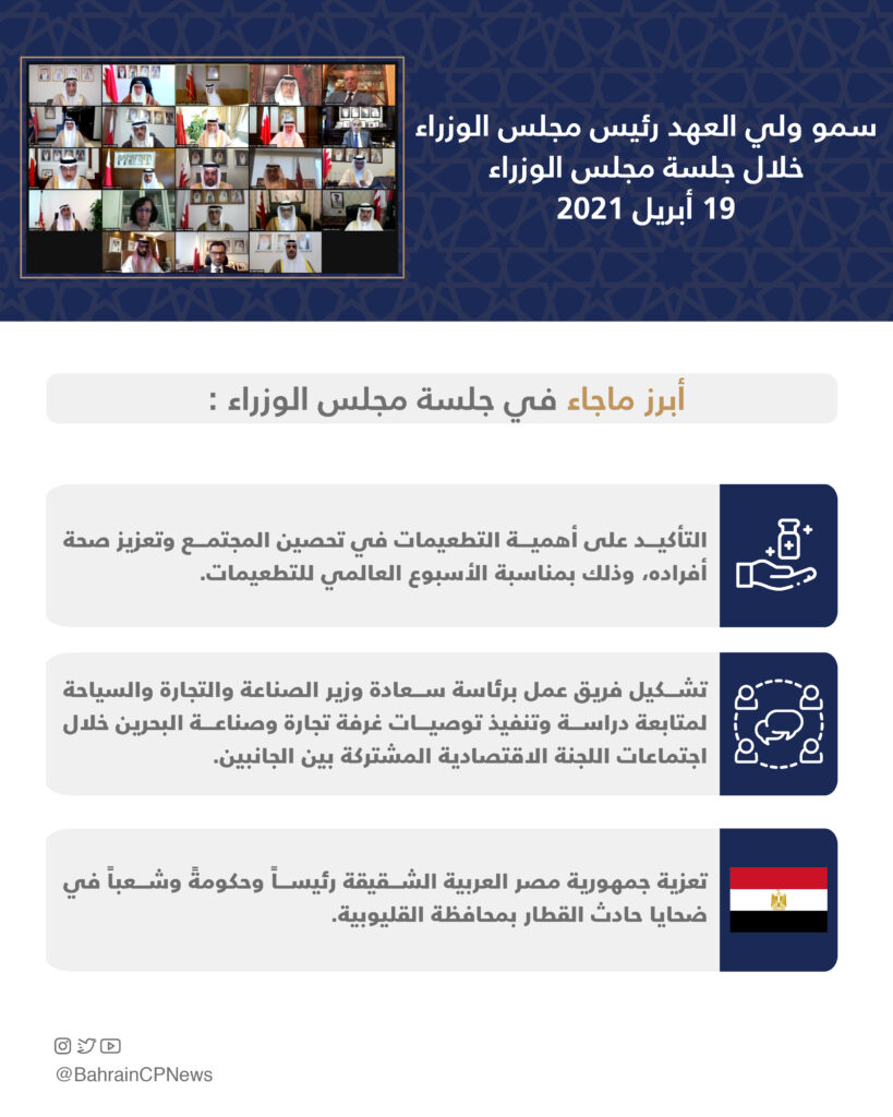 The cabinet then praised the Bahrain Chamber of Commerce and Industry’s efforts in stimulating commercial activities, and instructed the formation of a working group, to follow up on recommendations made by the Joint Economic Committee – which is chaired by the Minister of Industry, Commerce and Tourism.