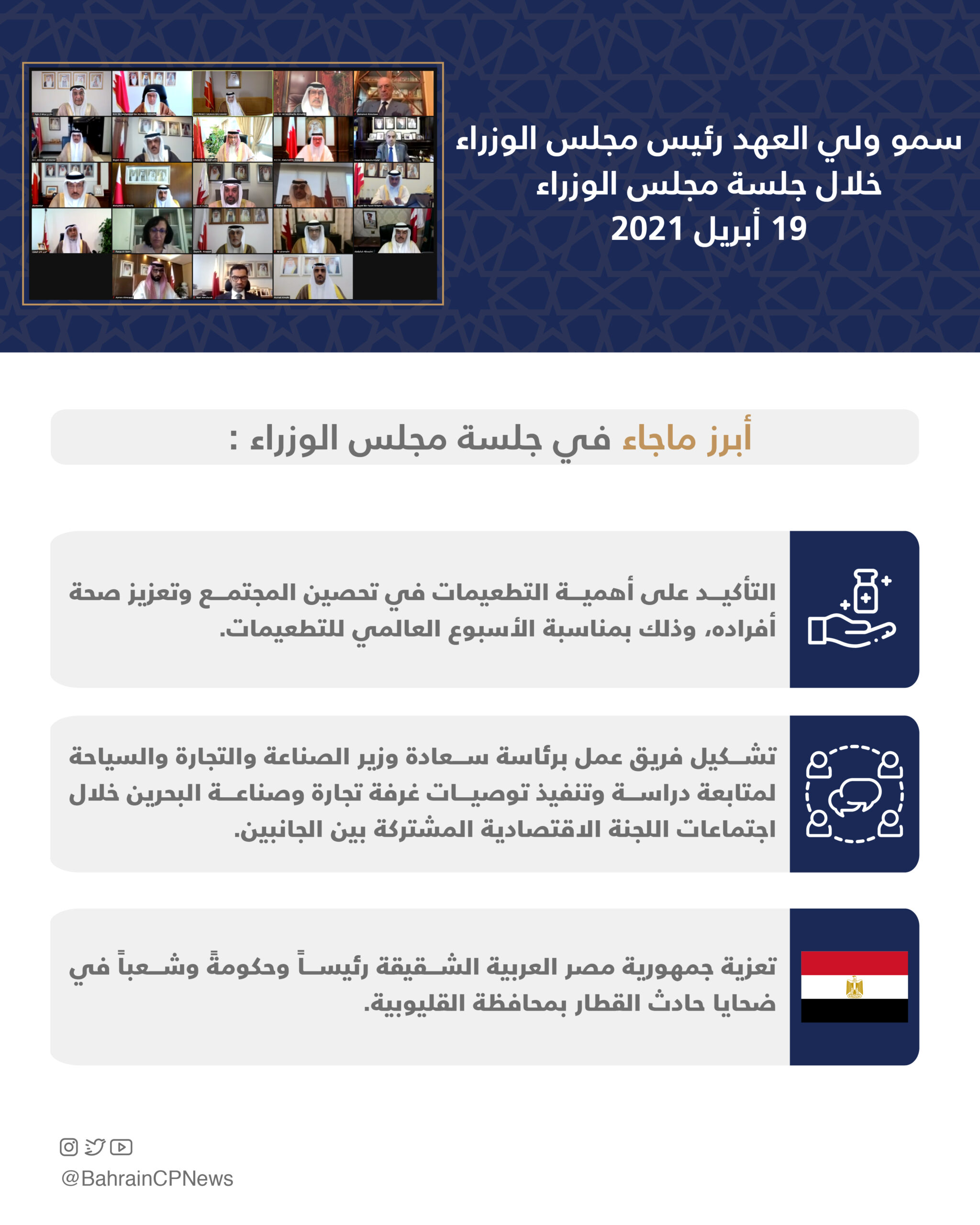His Royal Highness Prince Salman bin Hamad Al Khalifa, the Crown Prince and Prime Minister, today chaired the weekly cabinet meeting, held remotely.