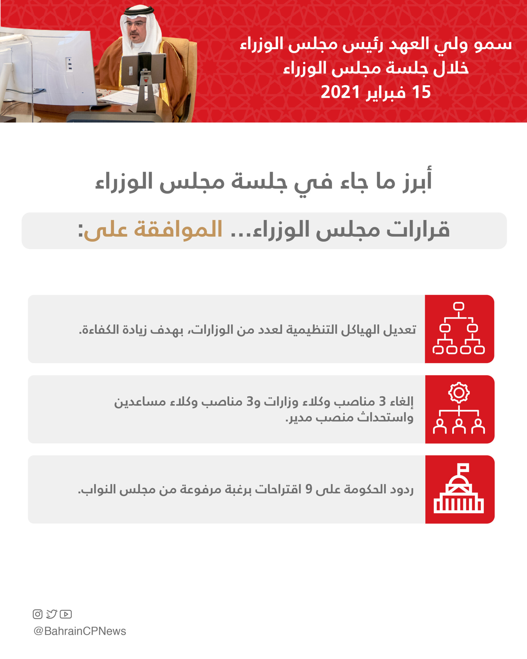 His Royal Highness Prince Salman bin Hamad Al Khalifa, the Crown Prince and Prime Minister today chaired the weekly Cabinet meeting, held remotely