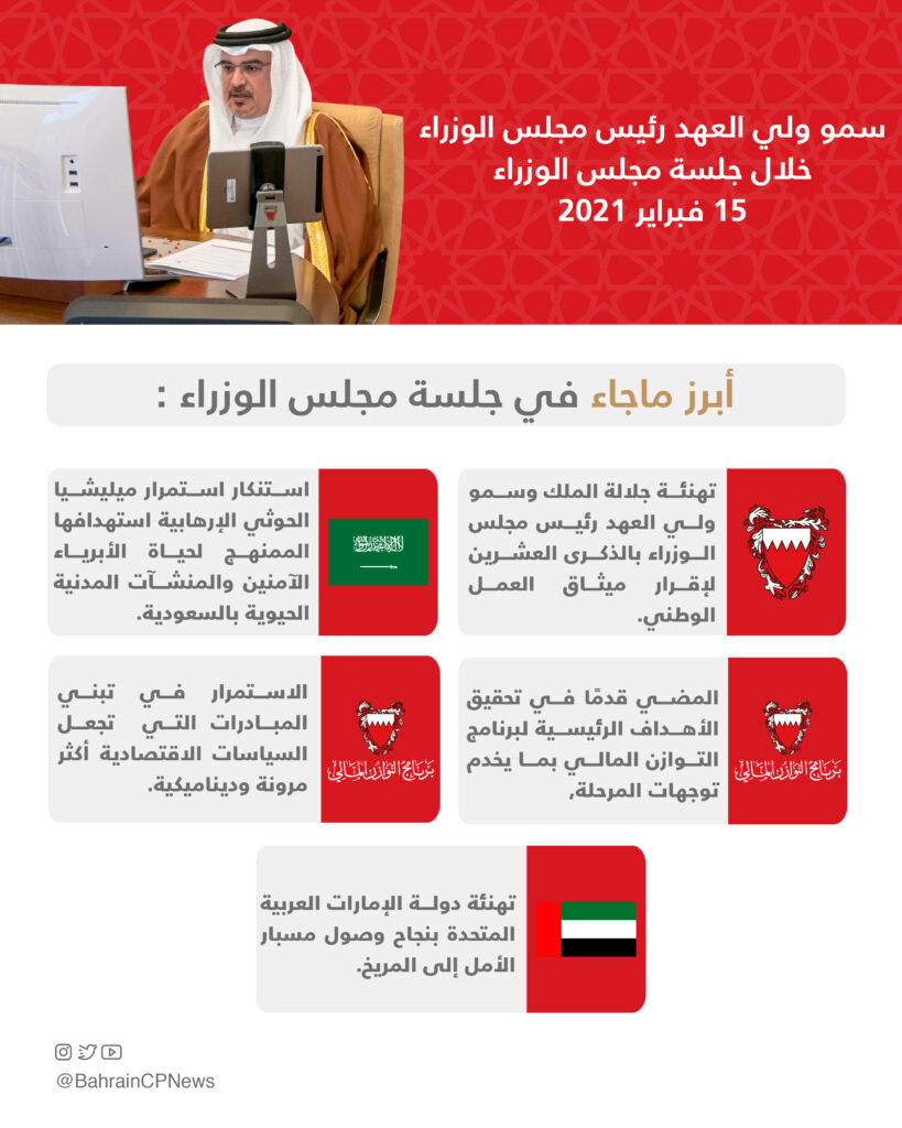 The Cabinet stressed the Kingdom of Bahrain’s condemnation of the deliberate and systematic attacks from the terrorist Houthi militia targeting Abha International Airport in the Kingdom of Saudi Arabia with bomb-laden drones, stating that these attacks endanger the lives of innocent people and are in flagrant violation of international humanitarian law. The Cabinet reiterated Bahrain’s position in support of the Kingdom of Saudi Arabia in its response to these serious terrorist attacks.