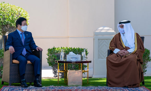 His Royal Highness Prince Salman bin Hamad Al Khalifa, the Crown Prince and Prime Minister, today received the Speaker of the National Assembly of the Republic of Korea, His Excellency Park Byeong-seug, at Riffa Palace.