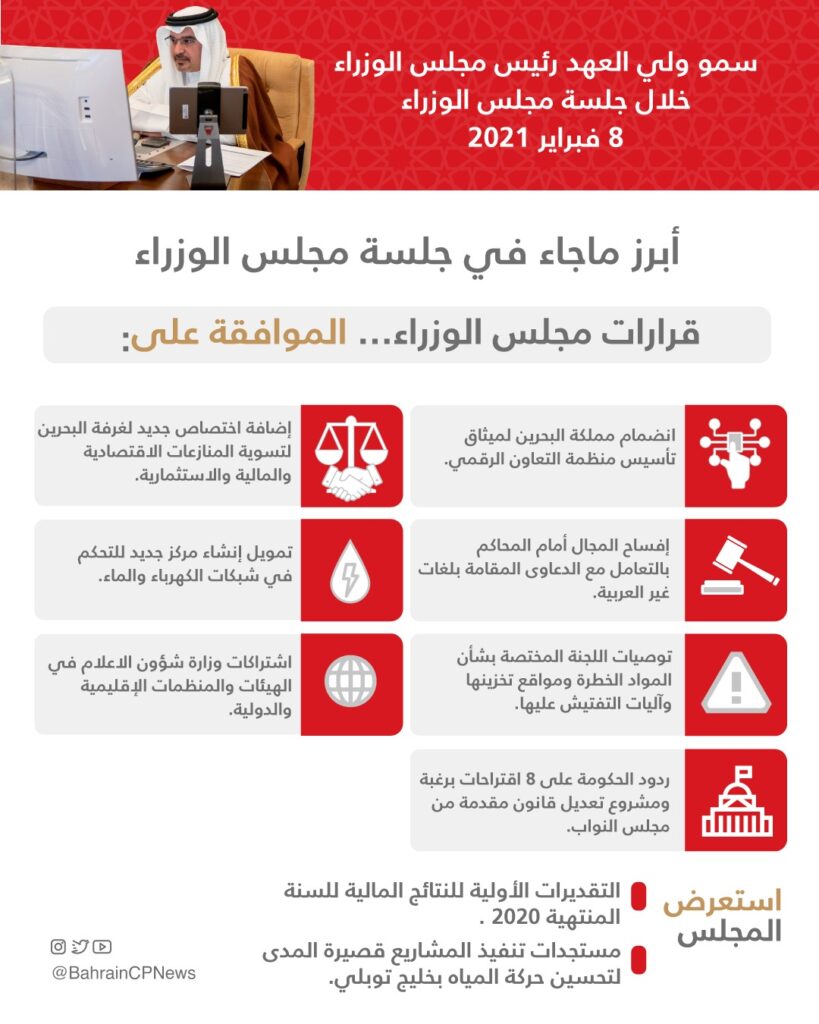 1. A memorandum from the Ministerial Committee for Legal and Legislative Affairs regarding the Kingdom of Bahrain’s accession to the charter establishing the Digital Cooperation Organization, which aims to develop the digital economy and strengthen economic collaboration and investment among member nations.