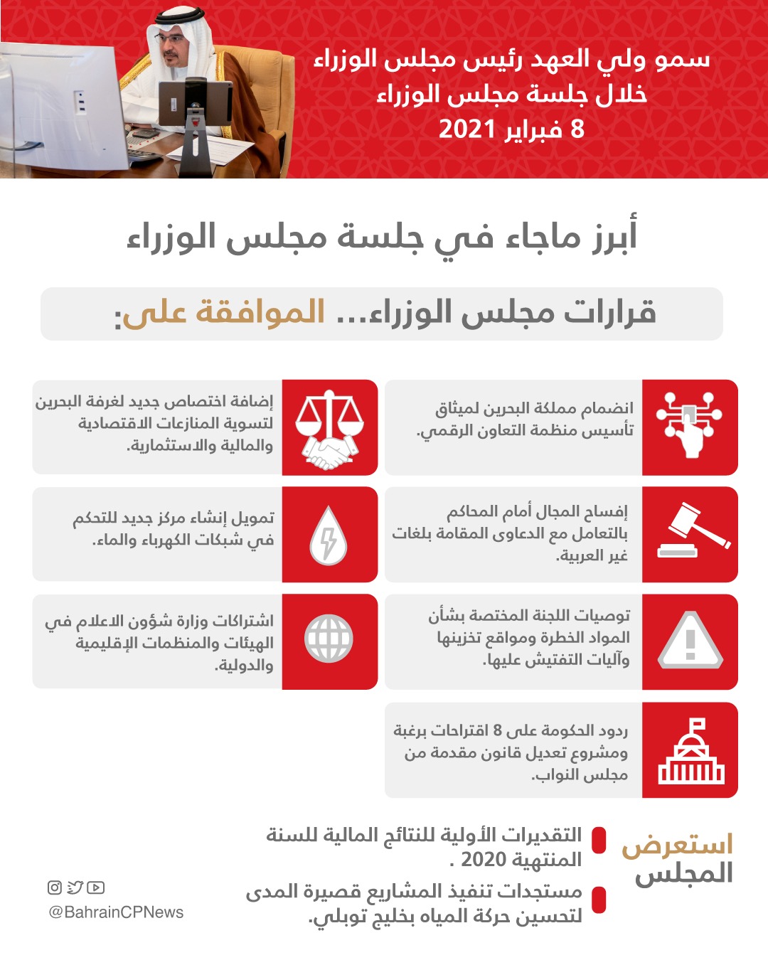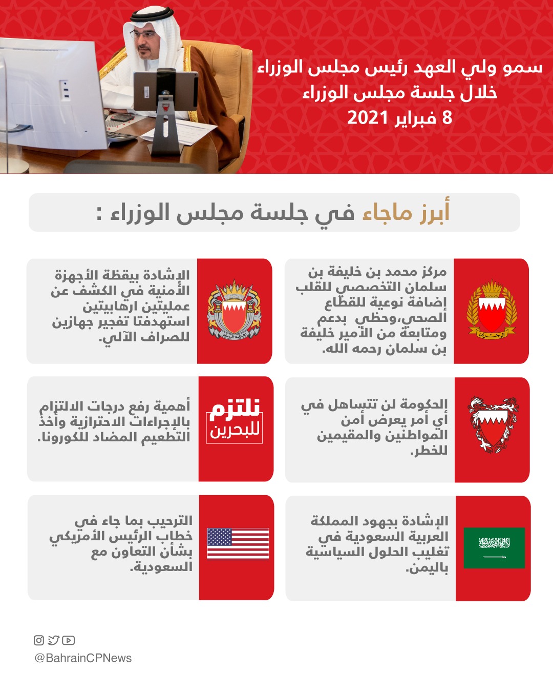 HRH the Crown Prince and Prime Minister today chaired the weekly Cabinet meeting, held remotely.