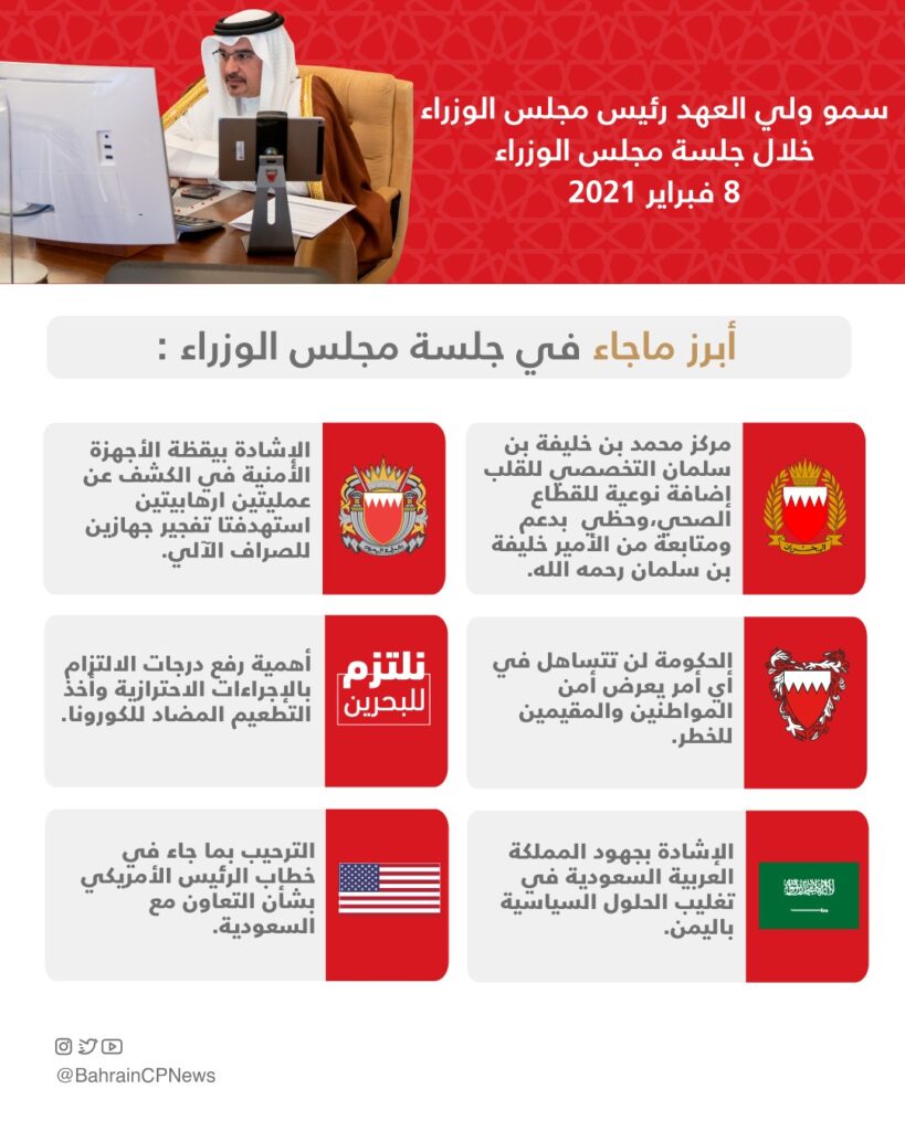 The Cabinet reviewed COVID-19 developments and once again stressed the importance of a renewed commitment to precautionary procedures and preventative measures, as well as encouraging citizens and residents to register for vaccination. The Cabinet underlined the call for Team Bahrain, made up of citizens and residents, to adhere to all instructions issued by the National Taskforce for Combatting the Coronavirus in the interest of the health and safety of all. In this regard, the Cabinet expressed its appreciation to health workers for their unwavering efforts in safeguarding the community in Bahrain.