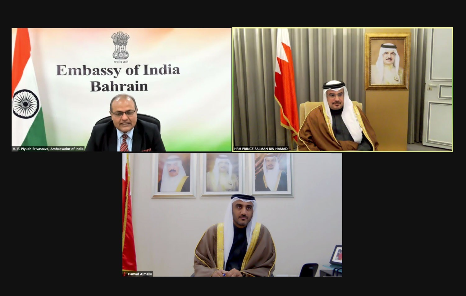His Royal Highness Prince Salman bin Hamad Al Khalifa, the Crown Prince and Prime Minister, today met remotely with the newly appointed Ambassador of the Republic of India to the Kingdom of Bahrain, HE Piyush Srivastava.