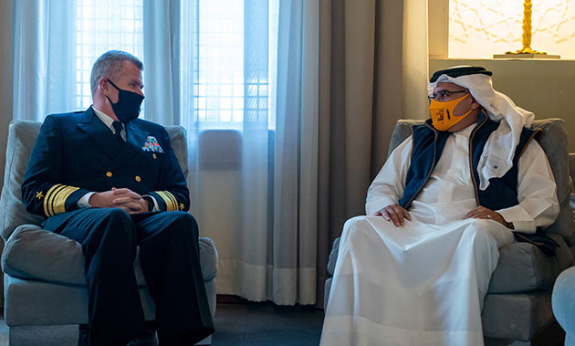His Royal Highness Prince Salman bin Hamad Al Khalifa, the Crown Prince, Deputy Supreme Commander and Prime Minister, today met with the Commander of the U.S. Naval Forces Central Command, U.S. 5th Fleet and Combined Maritime Forces, Vice Admiral Samuel Paparo, at Riffa Palace.