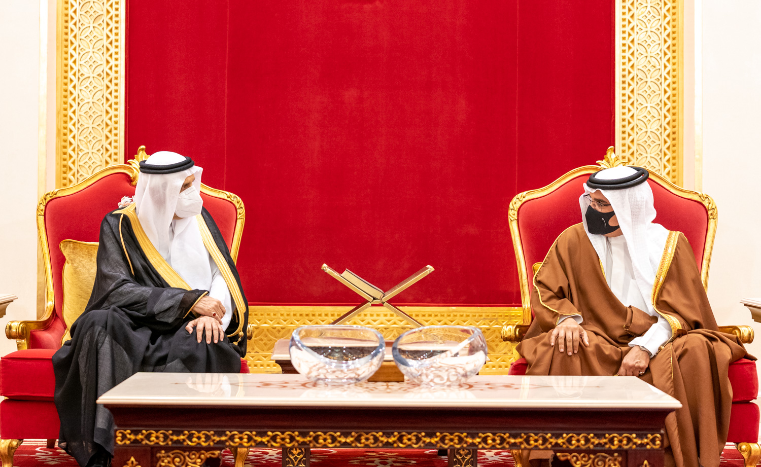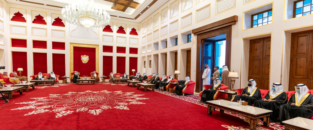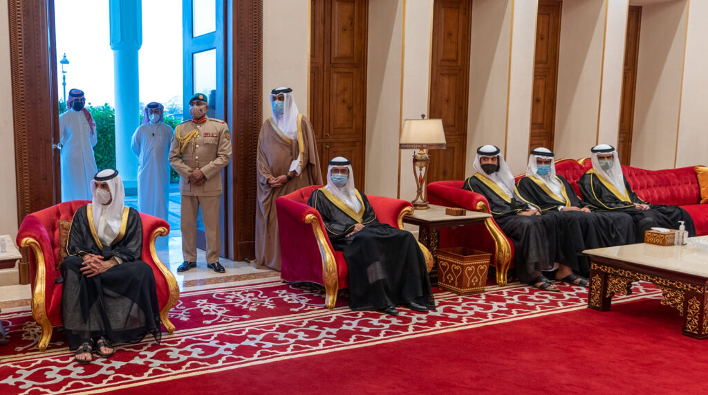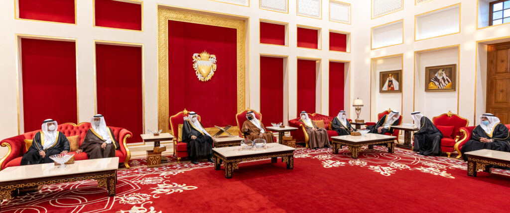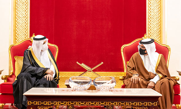 His Royal Highness Prince Salman bin Hamad Al Khalifa, the Crown Prince and Prime Minister, today received the Minister of State, Member of the Cabinet and Advisor to the Custodian of the Two Holy Mosques, HRH Prince Dr Mansour bin Mutaib bin Abdulaziz Al Saud, the Minister of Energy, HRH Prince Abdulaziz bin Salman bin Abdulaziz Al Saud, and their accompanying delegation, to offer condolences following the passing of His Royal Highness Prince Khalifa bin Salman Al Khalifa, at Sakhir Air Base.