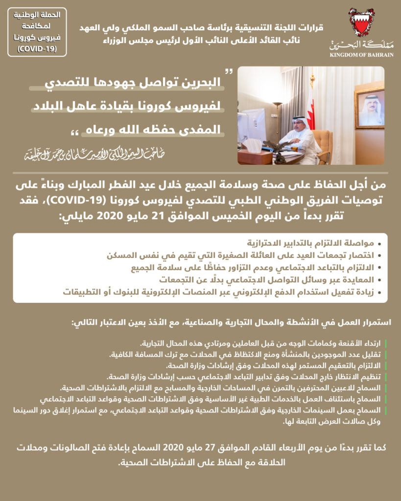 Following consideration of a report submitted by the National Taskforce for Combating the Coronavirus, headed by HE Lieutenant-General Dr. Shaikh Mohammed bin Abdullah Al Khalifa, Chairman of the Supreme Council of Health, various decisions were taken to ensure the safety and health of all during the Eid Al-Fitr holidays.