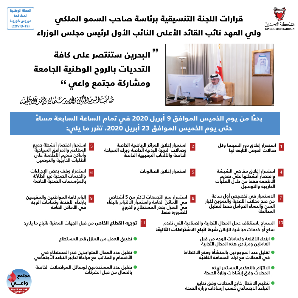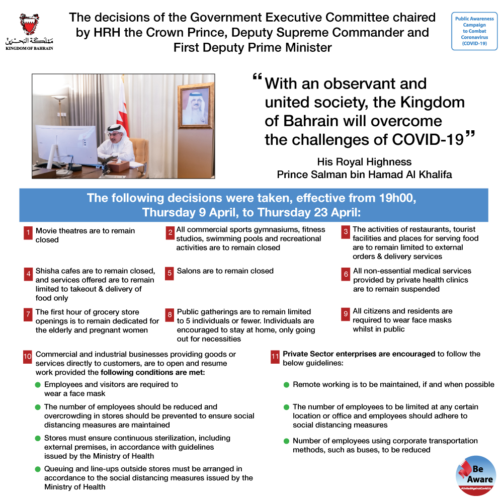 Following the consideration of a report submitted by the National Medical Task Force to Combat the Coronavirus, headed by HE Lieutenant-General Dr. Shaikh Mohammed bin Abdullah Al Khalifa, Chairman of the Supreme Council of Health, the following decisions were taken, effective from 19h00, Thursday 09 April, to Thursday 23 April: