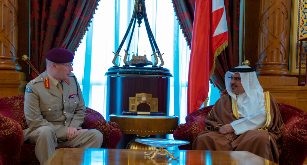 His Royal Highness Prince Salman bin Hamad Al Khalifa, Crown Prince, Deputy Supreme Commander, and First Deputy Prime Minister, today received the United Kingdom’s Defence Senior Advisor to the Middle East, Lieutenant General Sir John Lorimer, at Gudaibiya Palace.