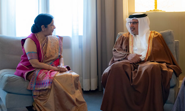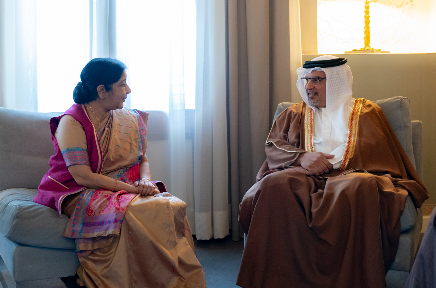 His Royal Highness Prince Salman bin Hamad Al Khalifa, Crown Prince, Deputy Supreme Commander and First Deputy Prime Minister, today met the Minister of External Affairs for the Republic of India, Her Excellency Sushma Swaraj, at Riffa Palace. Bahrain’s Foreign Minister His Excellency Shaikh Khalid bin Ahmed bin Mohammed Al Khalifa attended the meeting.