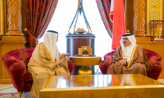 His Royal Highness Prince Salman bin Hamad Al-Khalifa, the Crown Prince, Deputy Supreme Commander and First Deputy Prime Minister, today received Abdul Redha Abdulla Khoury, Ambassador of the United Arab Emirates (UAE) to the Kingdom of Bahrain, at Gudaibiya Palace to mark the end of the Ambassador’s service in the Kingdom.