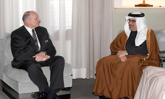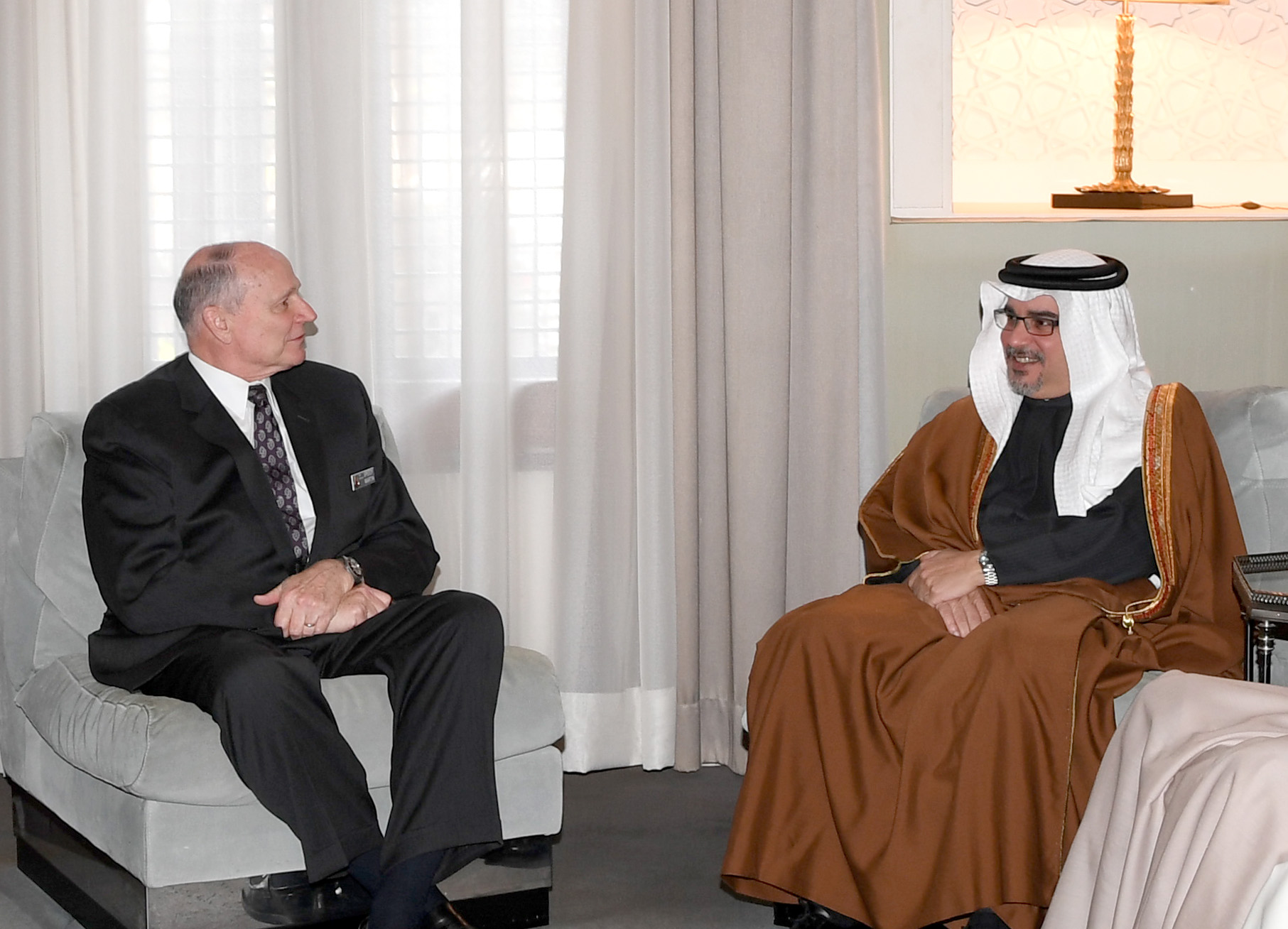His Royal Highness Prince Salman bin Hamad Al Khalifa, Crown Prince, Deputy Supreme Commander and First Deputy Prime Minister today met with General (Ret) Gregory S. Martin along with students of the United States National Defence University (USNDU) participating in the CAPSTONE Course, at Riffa Palace.