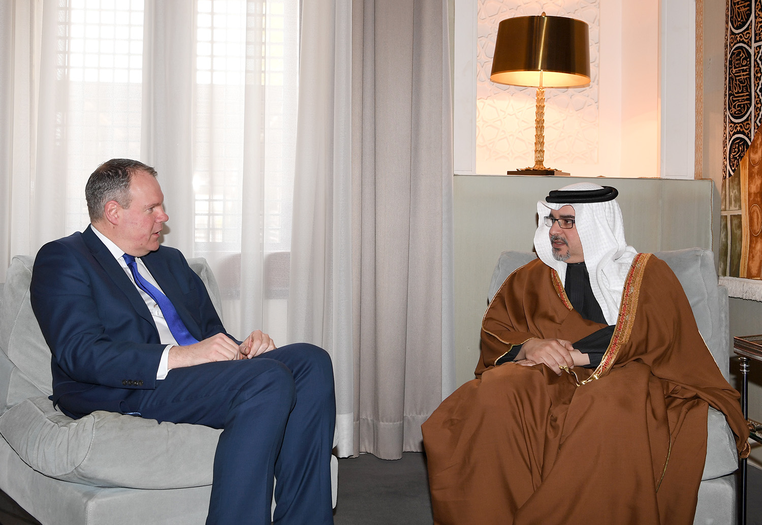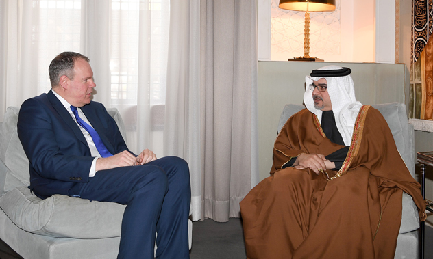 His Royal Highness Prince Salman bin Hamad Al Khalifa, Crown Prince, Deputy Supreme Commander and First Deputy Prime Minister today met with United Kingdom Member of Parliament and Chairman of the All Party Parliamentary Group on Bahrain, Conor Burns MP, at Riffa Palace.