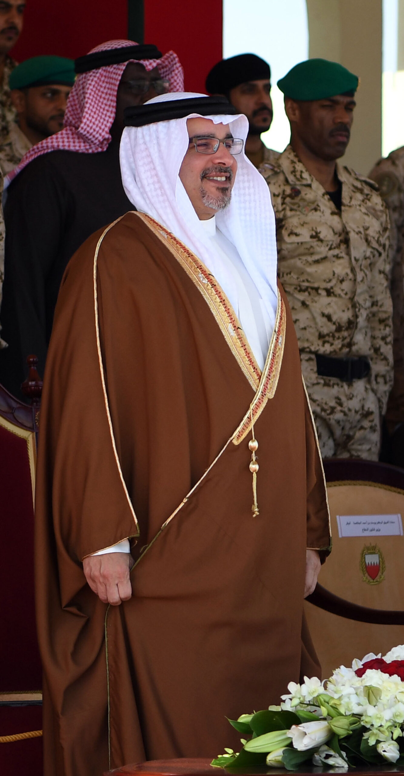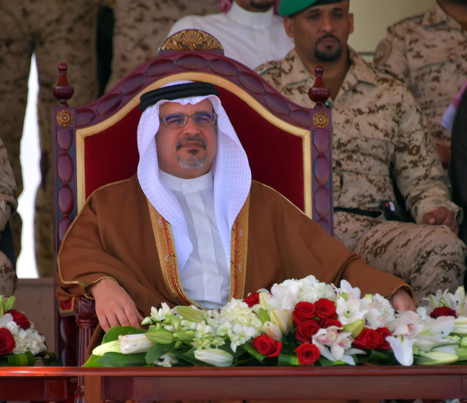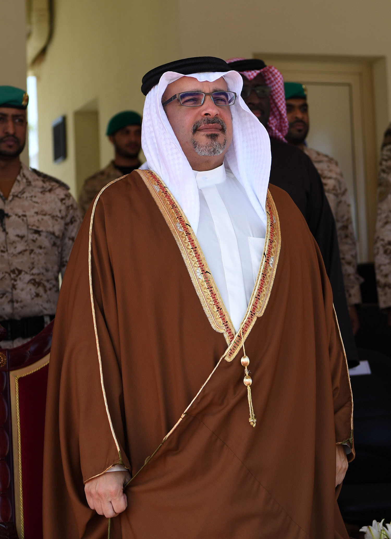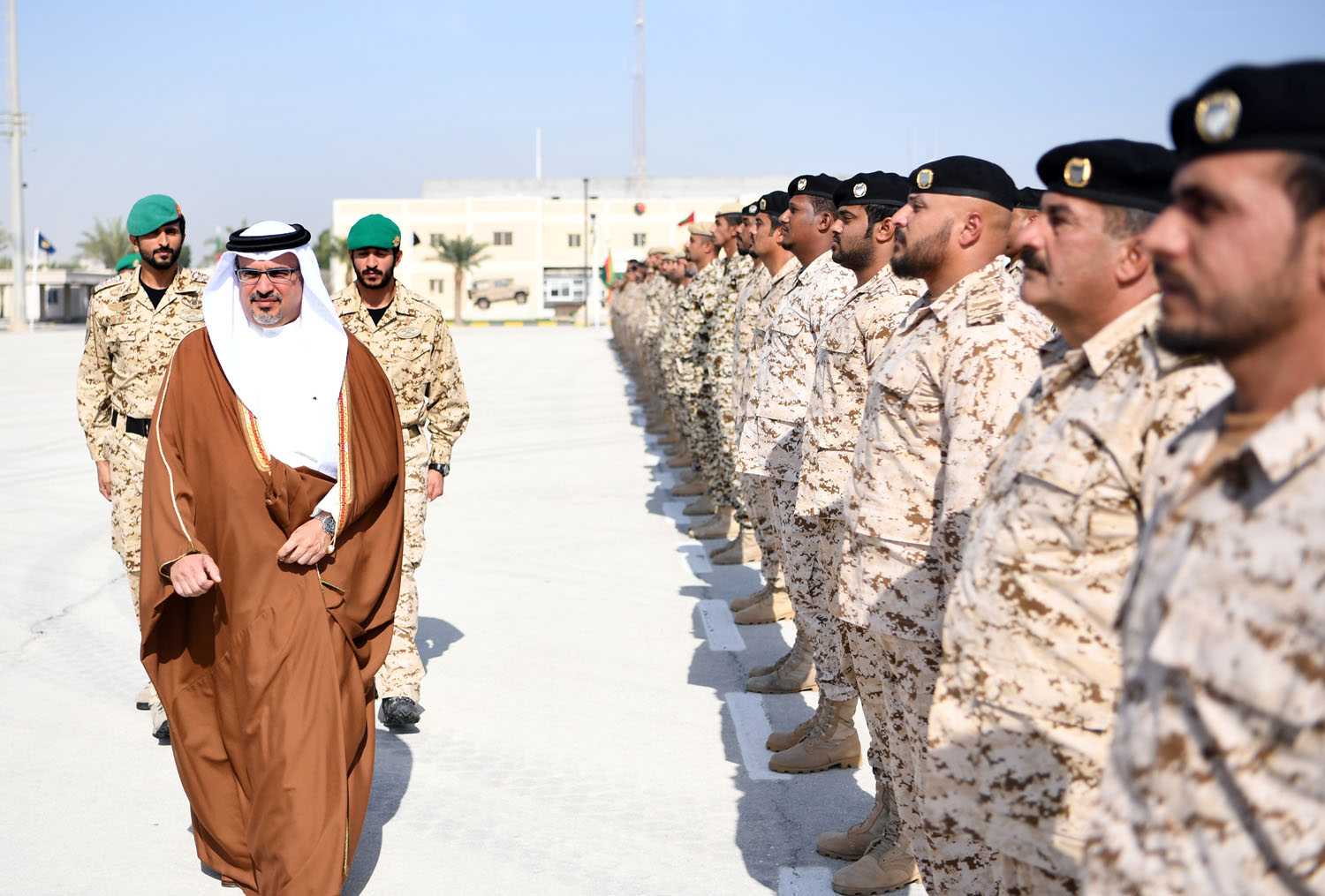 Upon his arrival, His Royal Highness was welcomed by the Royal Guards Commander, His Highness Brigadier Shaikh Nasser bin Hamad Al Khalifa, the Royal Guards Special Forces Commander, His Highness Major Shaikh Khaled bin Hamad Al Khalifa, and senior officers.