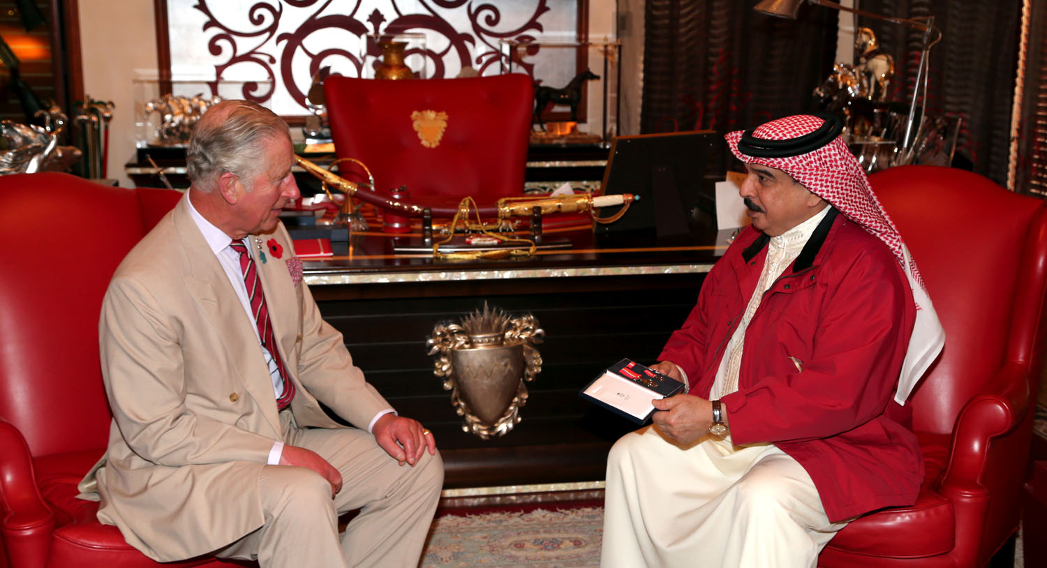 HRH Prince Charles expressed deepest thanks and appreciation to HM the King for the auspicious welcome and hospitality accorded to him and his spouse while in Bahrain, which, he said, reflects the authenticity of the Kingdom and the hospitality of its people, voicing admiration for the show of genuine Bahraini horses known for their beauty and high quality.