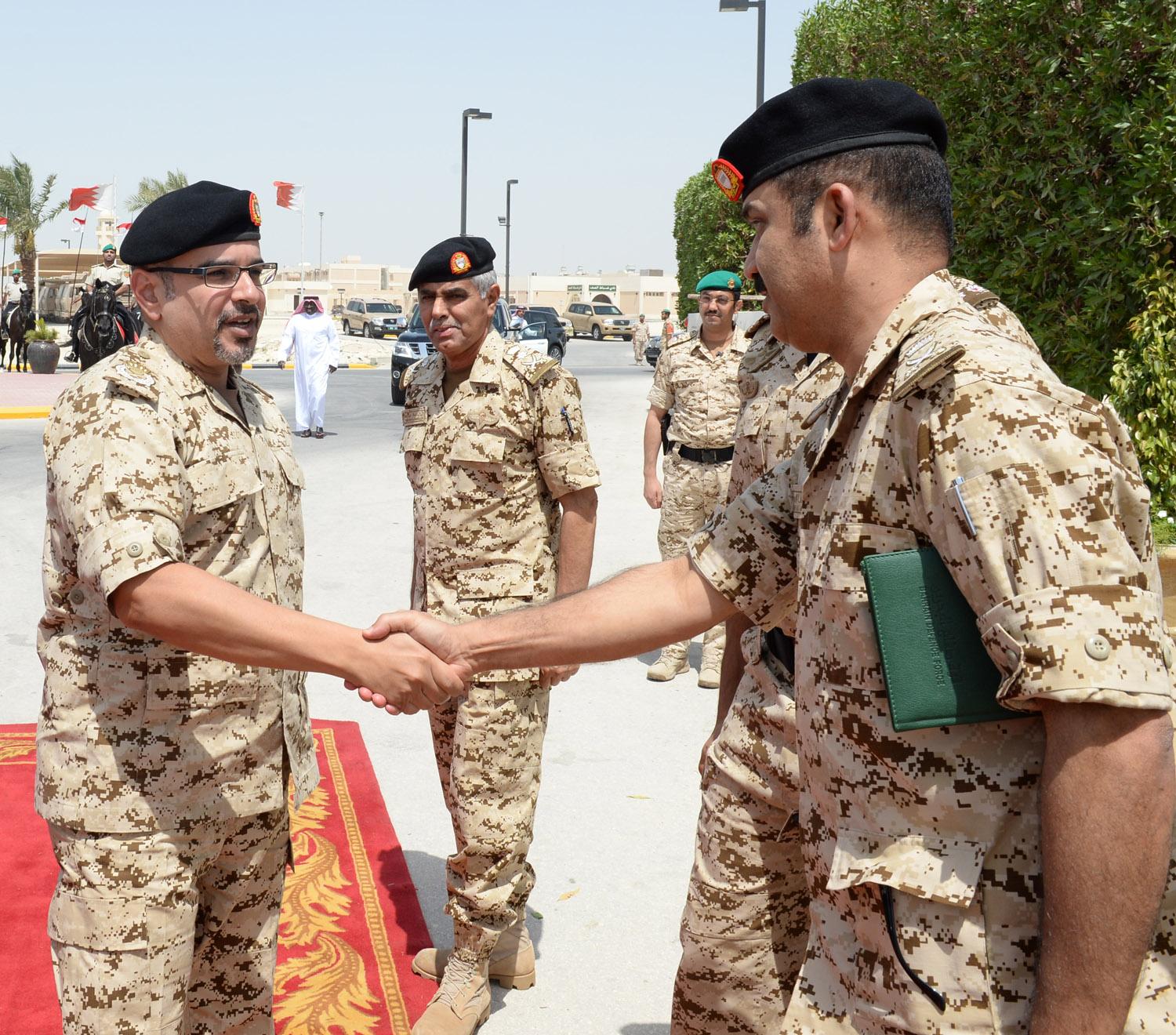 Upon his arrival, His Royal Highness was received by the Royal Guards Commander, His Highness Brigadier Shaikh Nasser bin Hamad Al Khalifa, and a number of senior officers.