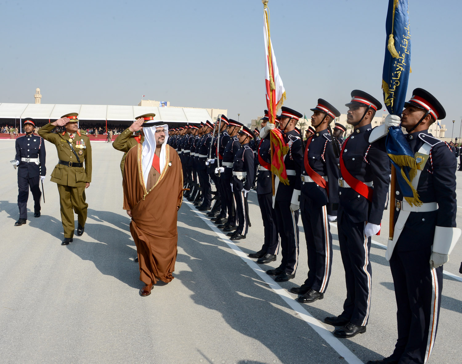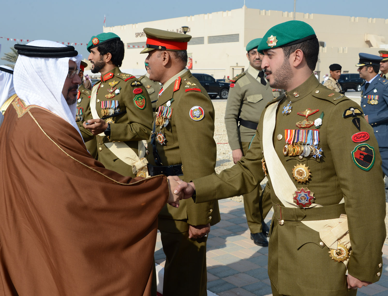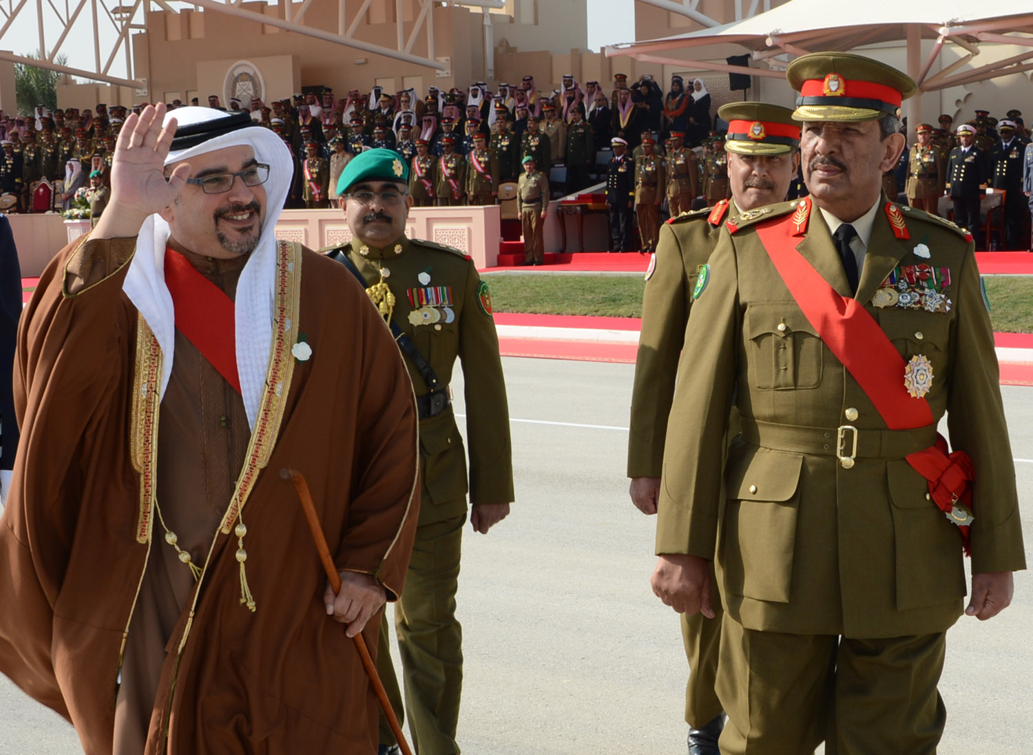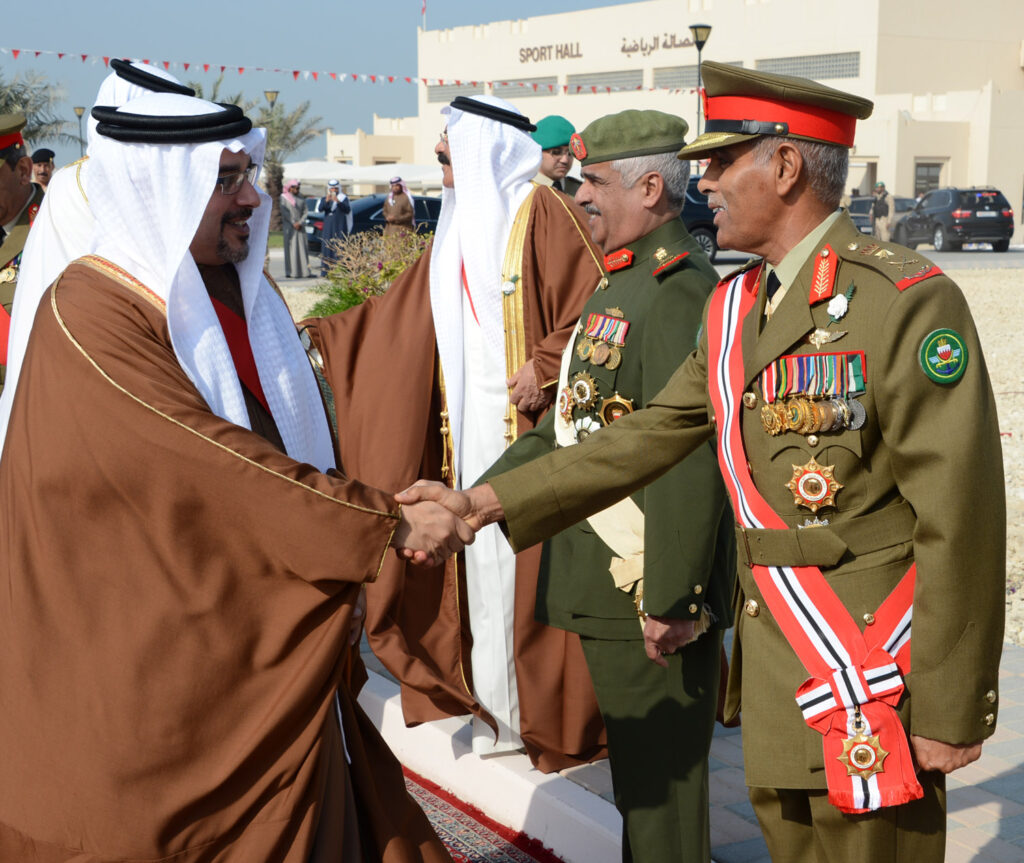Upon his arrival, His Royal Highness was welcomed by His Excellency Field Marshal Shaikh Khalifa bin Ahmed Al Khalifa, Commander in Chief of the Bahrain Defence Force (BDF); His Highness Lieutenant-General Shaikh Mohammed bin Isa Al Khalifa, National Guard Commander; His Excellency Lieutenant-General Yousif bin Ahmed Al Jalahma, Minister of Defence Affairs; His Excellency Lieutenant-General Theyab bin Saqer Al Noaimi, Chief of Staff; His Highness Brigadier Shaikh Nasser bin Hamad Al Khalifa, Commander of the Royal Guard; His Highness Major Shaikh Khaled bin Hamad Al Khalifa, Commander of the Royal Guard Special Forces; and a number of senior BDF officers.