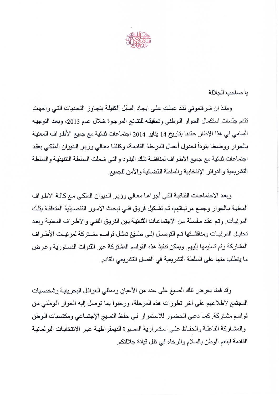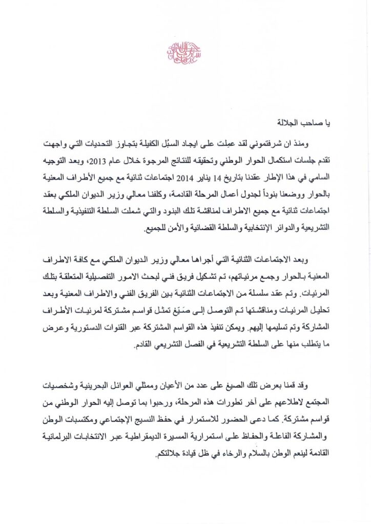 In January, following a year of protracted discussions where the parties were unable to achieve an agreed agenda, His Majesty instructed the Crown Prince to overcome existing obstacles and accelerate the resumption of dialogue. The Crown Prince subsequently conducted a series of meetings with the heads of all major political societies and a number of independent MPs. These meetings outlined a set of key topics from which bilateral talks progressed under the stewardship of the Royal Court Minister.