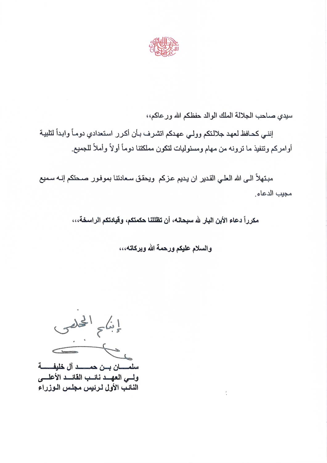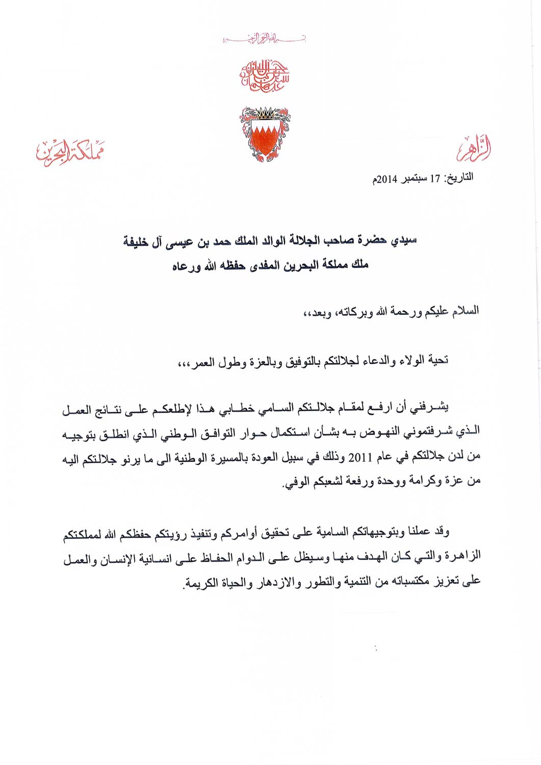 HRH Crown Prince Salman today delivered a framework comprising areas of common ground from Bahrain’s National Dialogue talks to His Majesty King Hamad.