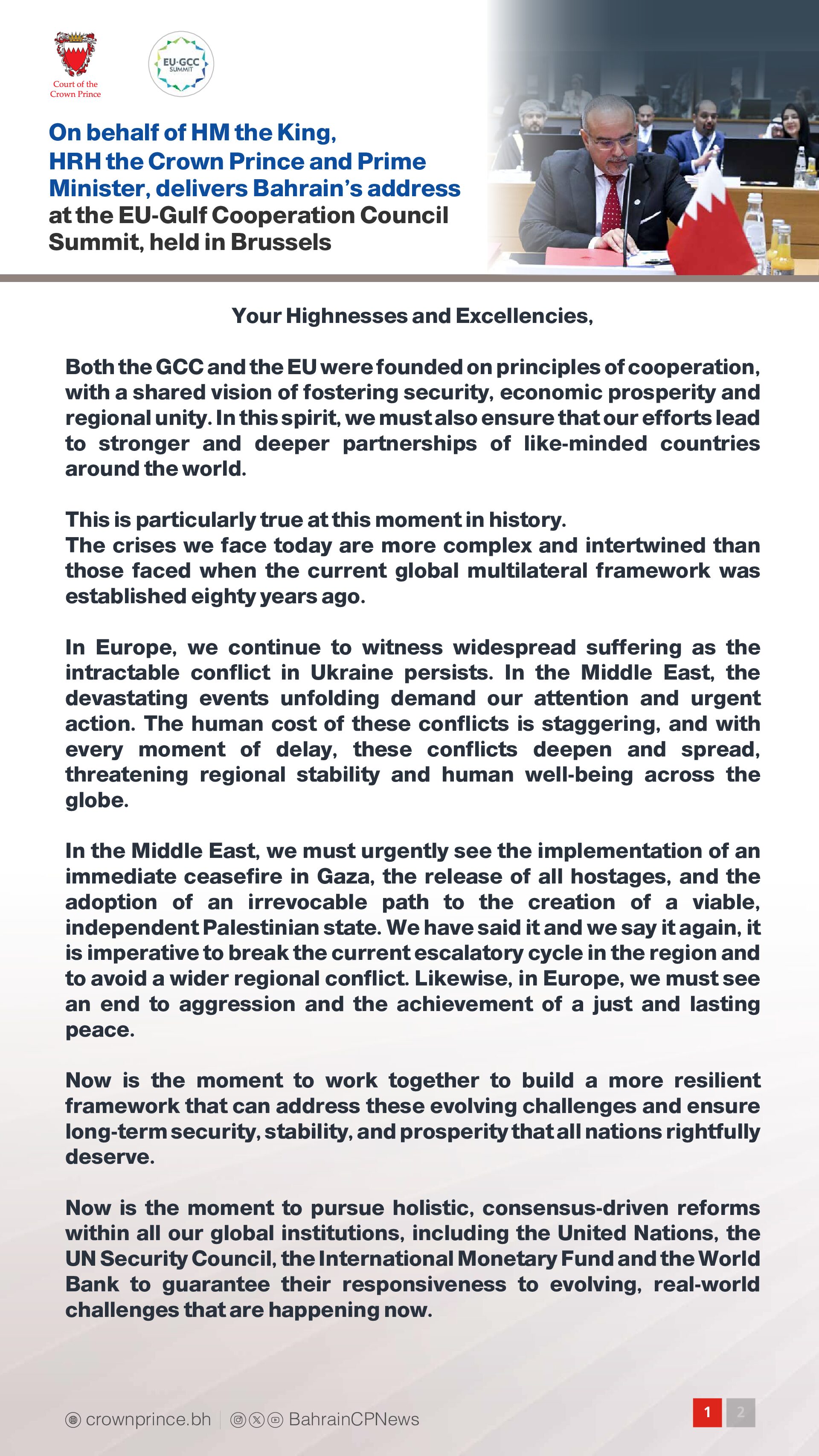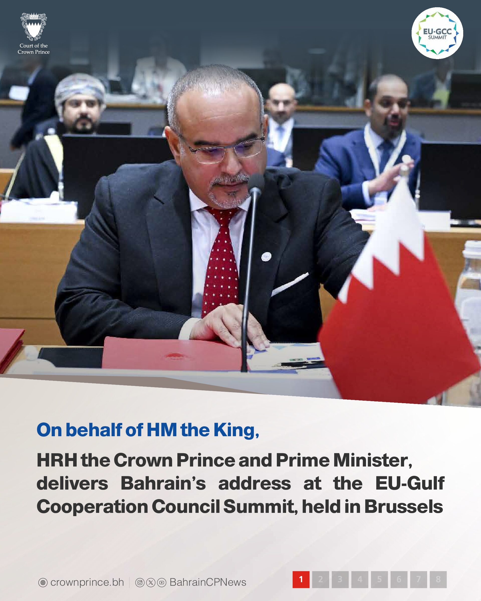 On behalf of His Majesty King Hamad bin Isa Al Khalifa, His Royal Highness Prince Salman bin Hamad Al Khalifa, the Crown prince and Prime Minister, participated today, and delivered Bahrain’s address at the opening session of the first EU-Gulf Cooperation Council Summit in Brussels, the Kingdom of Belgium.