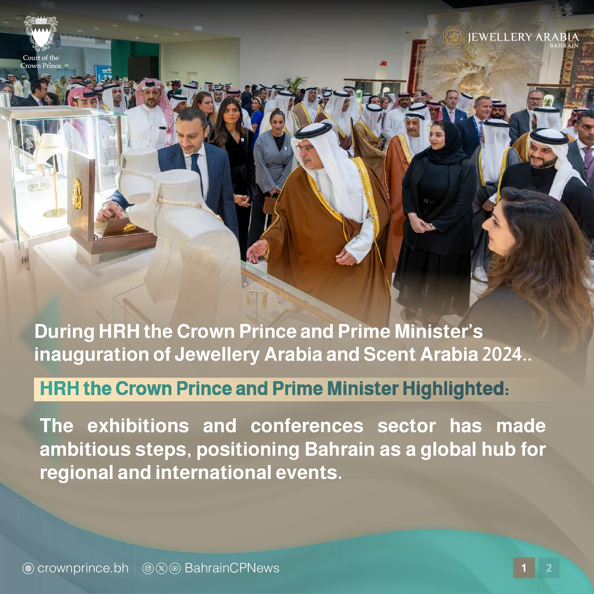 His Royal Highness Prince Salman bin Hamad Al Khalifa, the Crown Prince and Prime Minister, inaugurated the Jewellery Arabia and Scent Arabia 2024 exhibitions today at Exhibition World Bahrain in Sakhir.